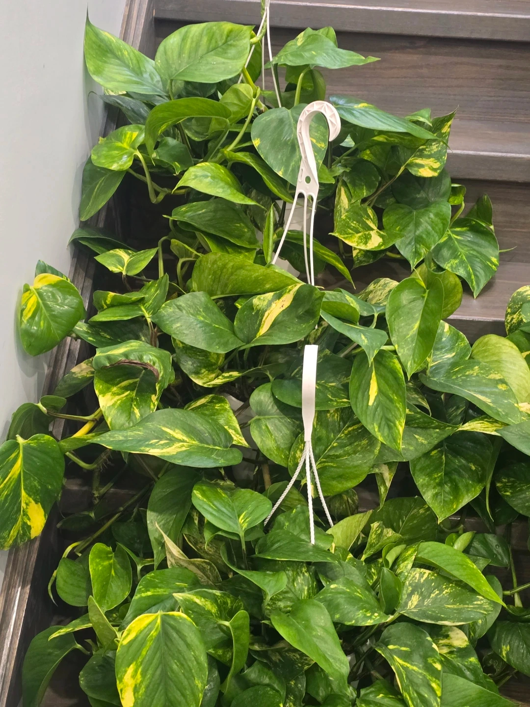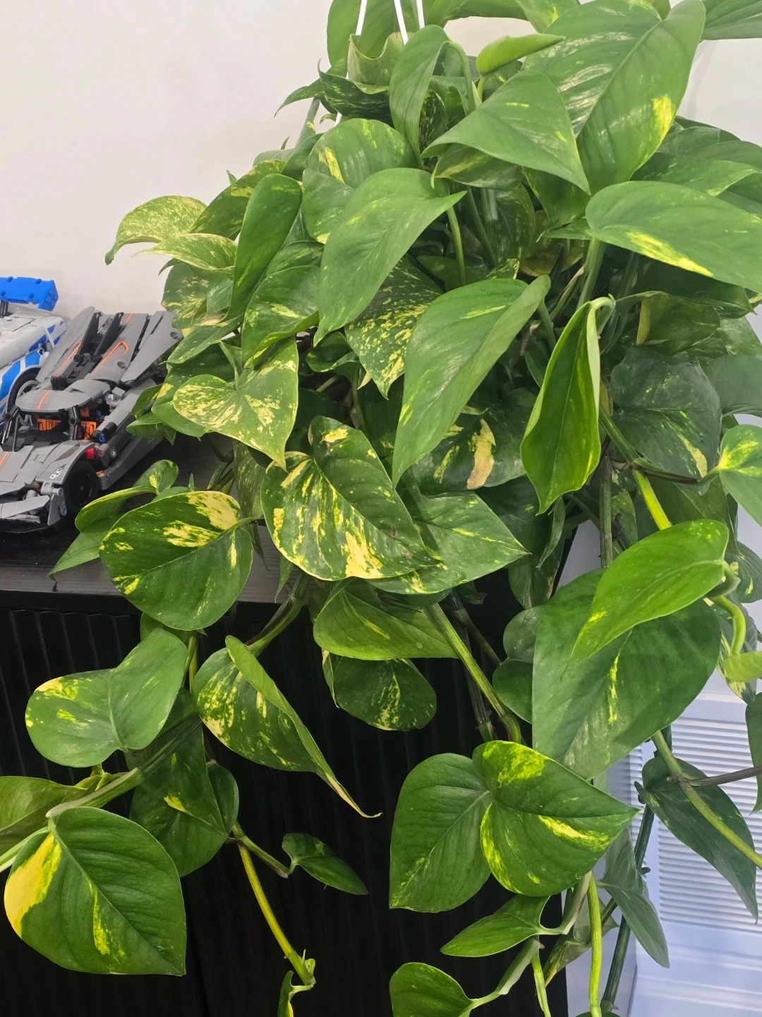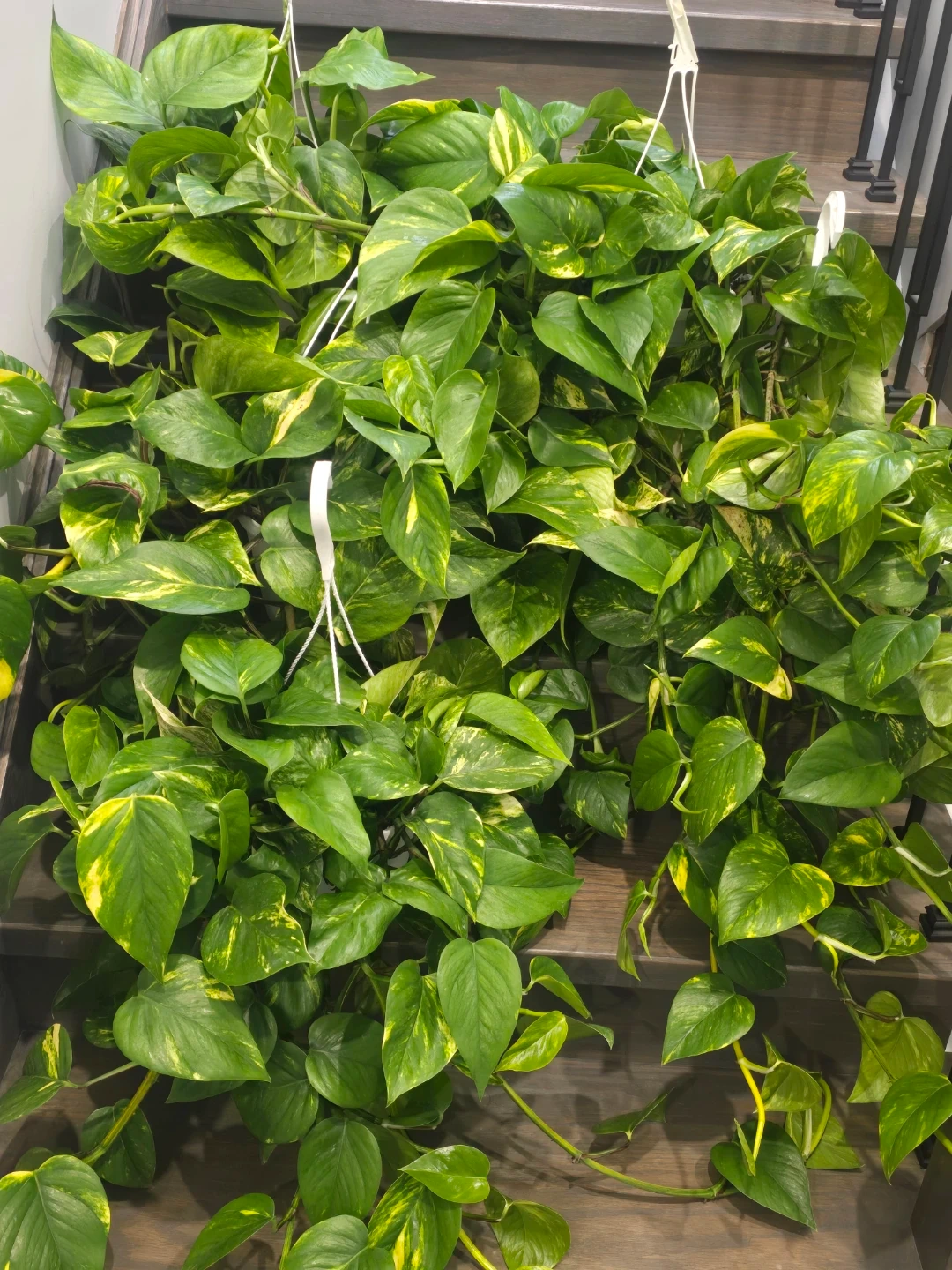 Lush and vibrant golden pothos plant with variegated green and yellow leaves. It's a healthy, trailing plant perfect for adding a touch of nature indoors. This plant is easy to care for and will brighten up any space!