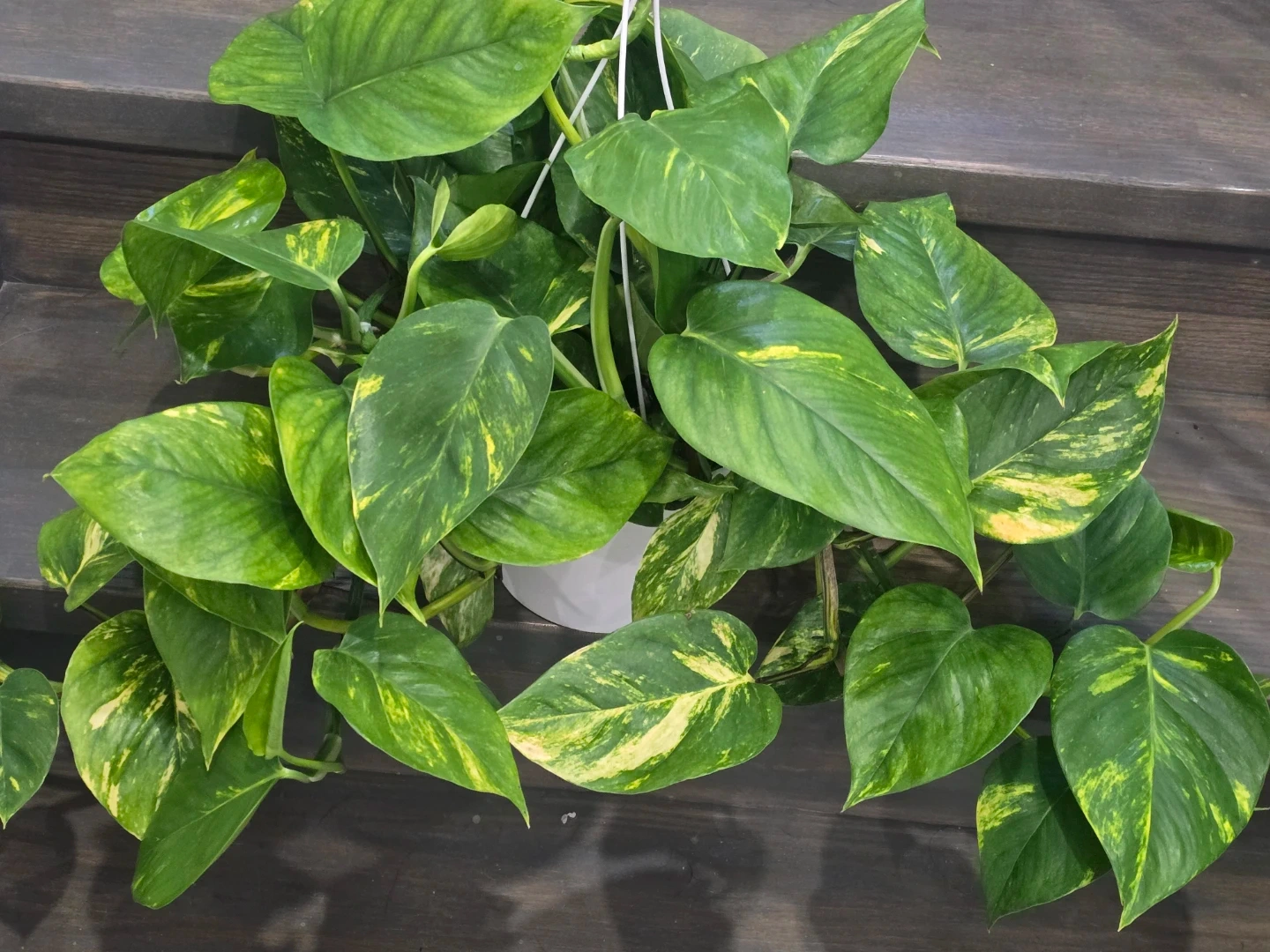 Lush and vibrant golden pothos plant with variegated green and yellow leaves. It's a healthy, trailing plant perfect for adding a touch of nature indoors. This plant is easy to care for and will brighten up any space!
