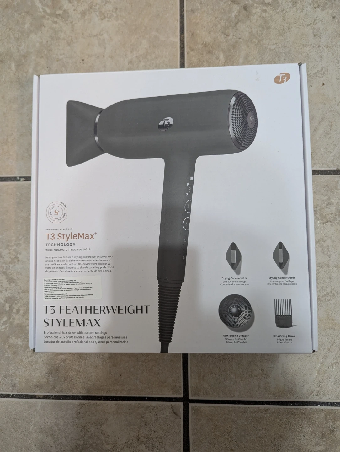 This is the T3 Featherweight StyleMax professional hair dryer. It includes a drying concentrator, a styling concentrator, a Soft Touch 3 diffuser, and a smoothing comb. The dryer offers custom settings for your hair texture and styling preference.