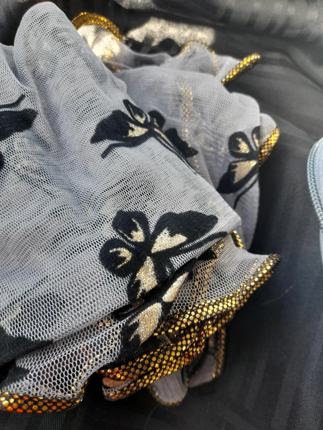 Sheer Black Butterfly Print Scarf with Gold Trim