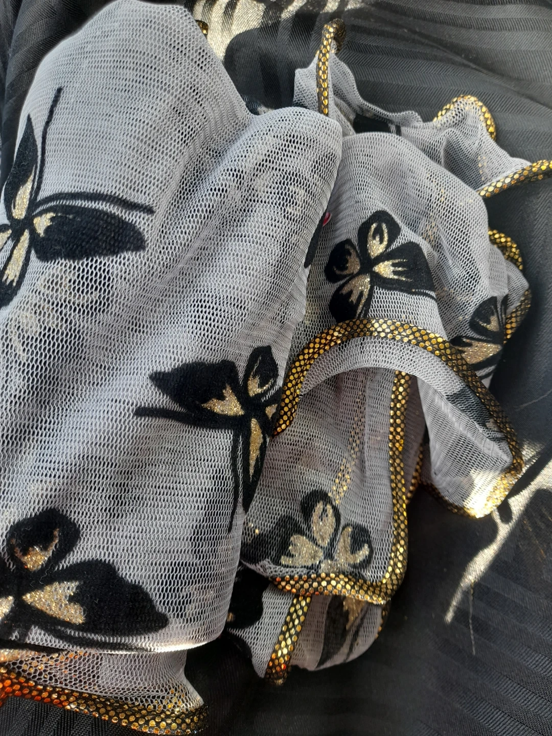 Sheer Black Butterfly Print Scarf with Gold Trim