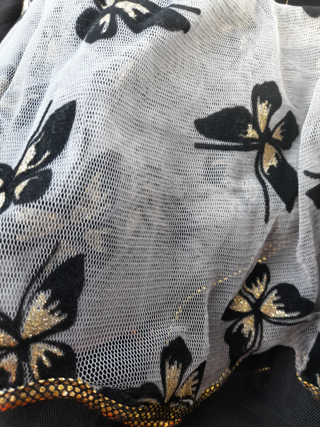 Lightweight sheer scarf with a black and gold butterfly print. It features a shimmering gold trim along the edges. This accessory adds a touch of elegance!