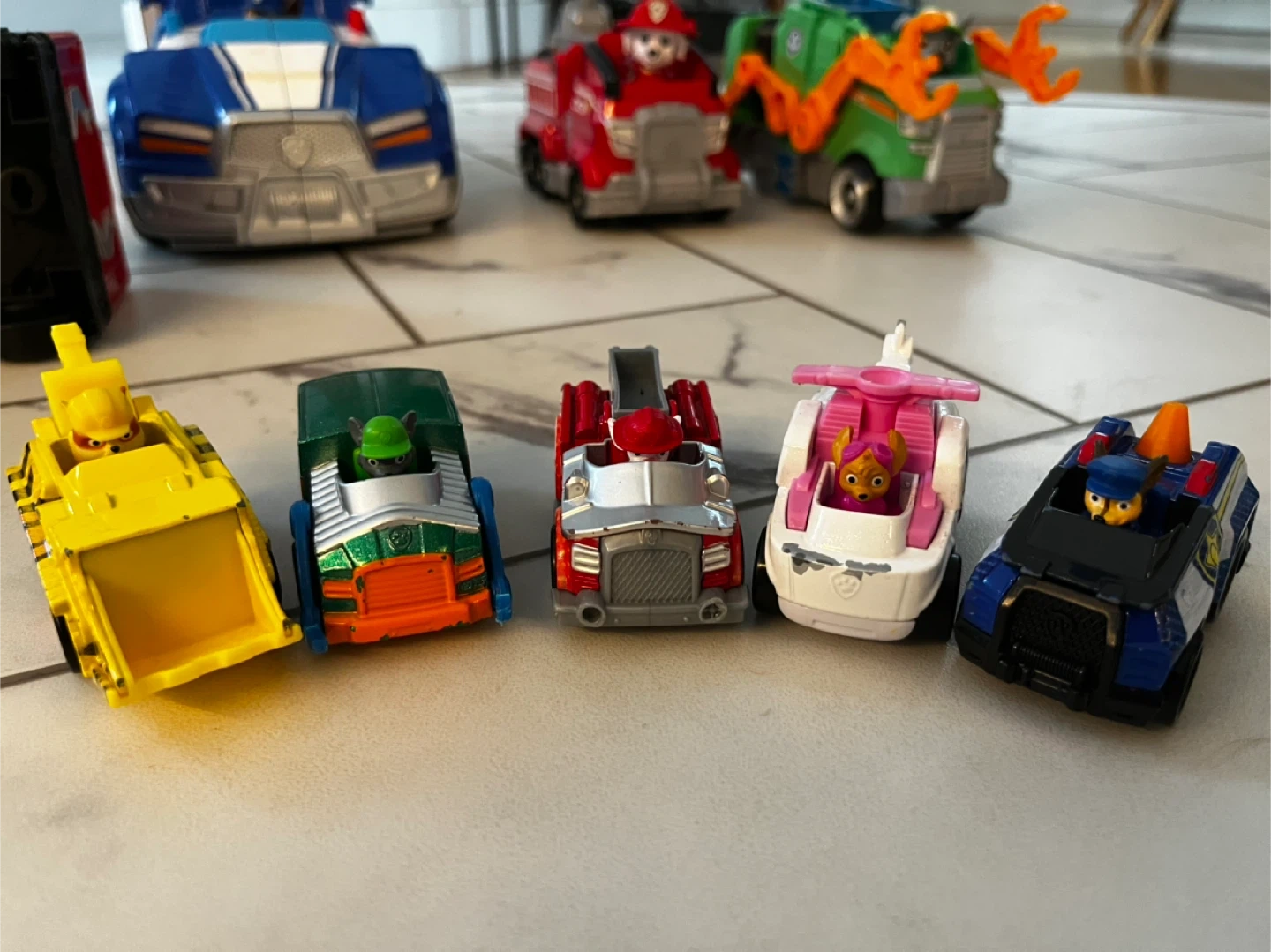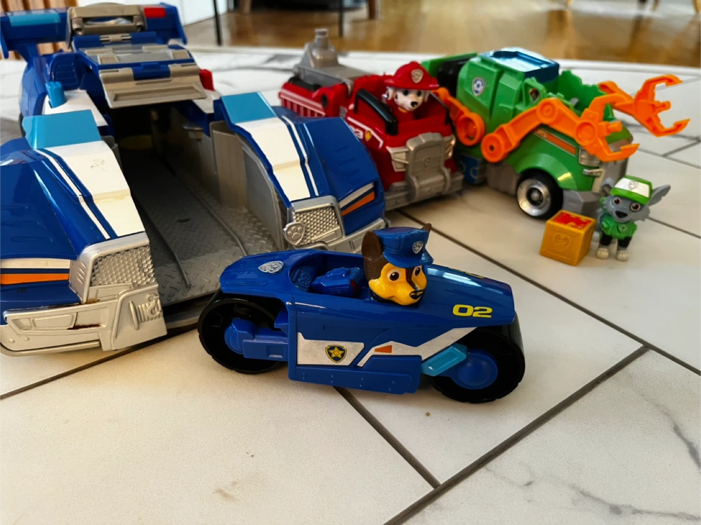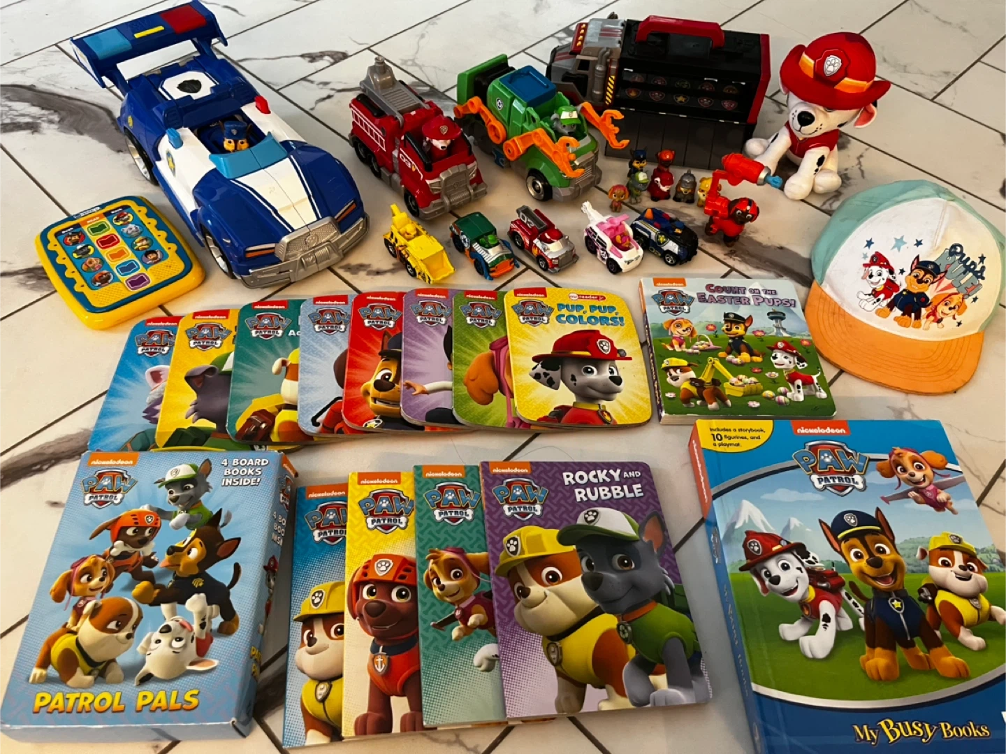 A collection of Paw Patrol toys including vehicles, figures, and a large mobile command centre. It also includes several Paw Patrol board books and a Me Reader Jr electronic book. This set is perfect for young fans of the show!