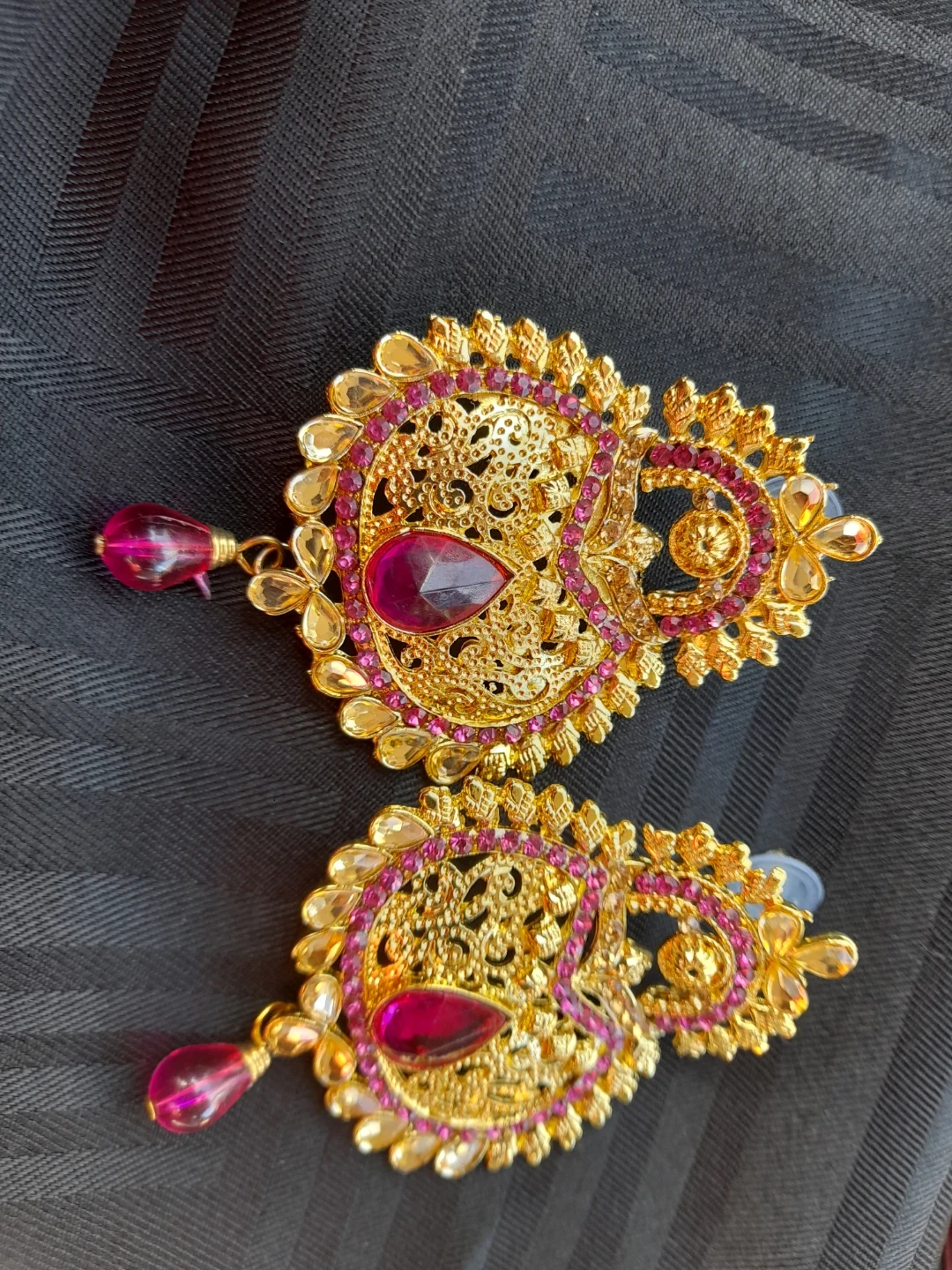 These beautiful gold-tone dangling earrings feature intricate detailing and vibrant pink gemstone drops. They're lightweight and add a touch of elegance to any outfit. Perfect for special occasions or everyday wear!