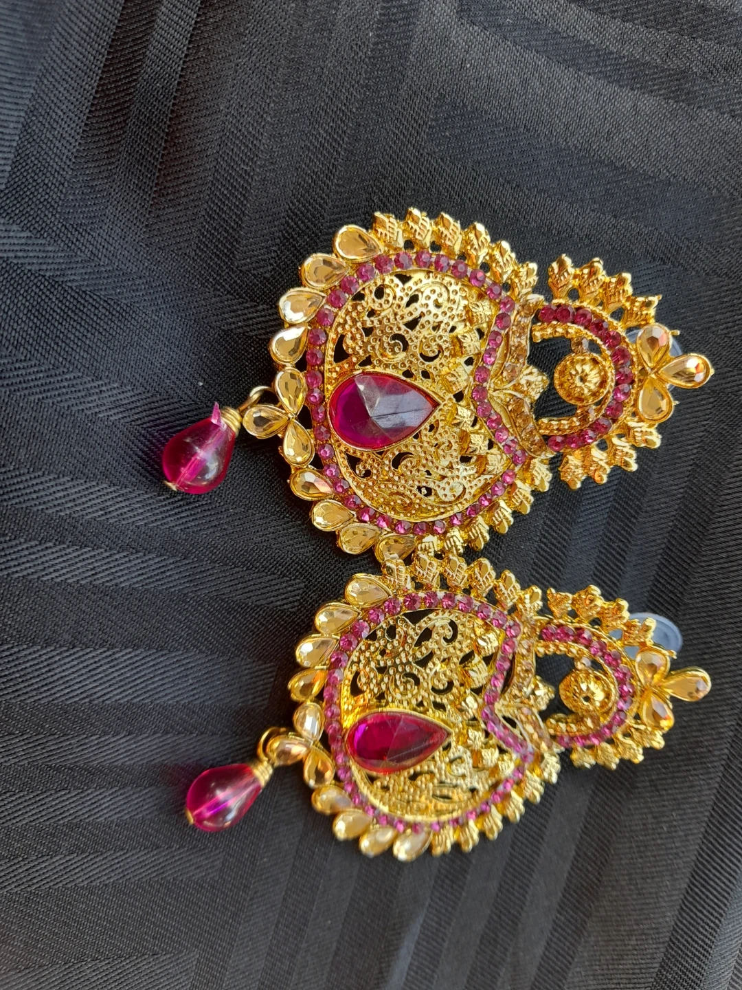 These beautiful gold-tone dangling earrings feature intricate detailing and vibrant pink gemstone drops. They're lightweight and add a touch of elegance to any outfit. Perfect for special occasions or everyday wear!