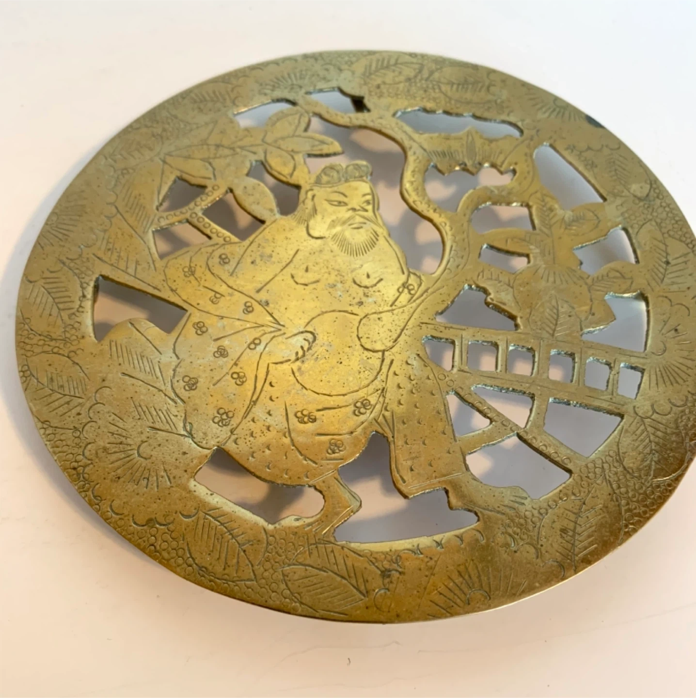 This is a decorative brass trivet featuring an intricate design of a Japanese warrior. It has a beautiful cut-out pattern that's very eye-catching. Great for protecting surfaces from hot dishes. Could be polished into a beautiful lustre.