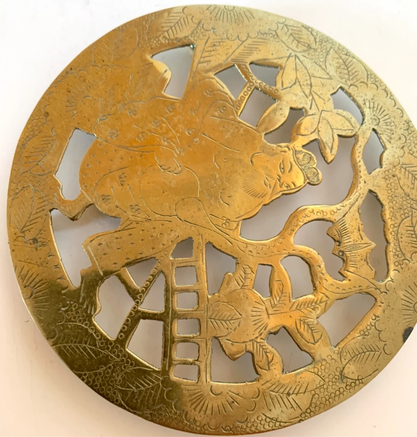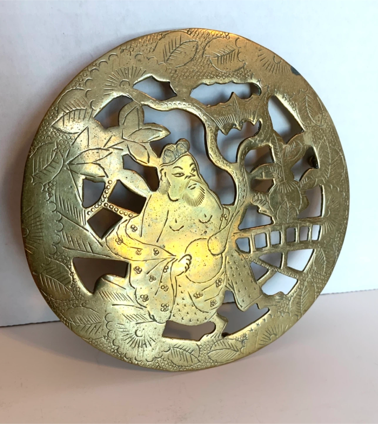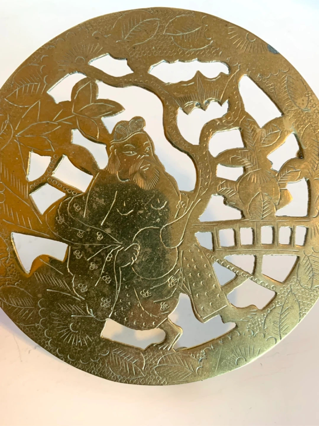 This is a decorative brass trivet featuring an intricate design of a Japanese warrior. It has a beautiful cut-out pattern that's very eye-catching. Great for protecting surfaces from hot dishes. Could be polished into a beautiful lustre.