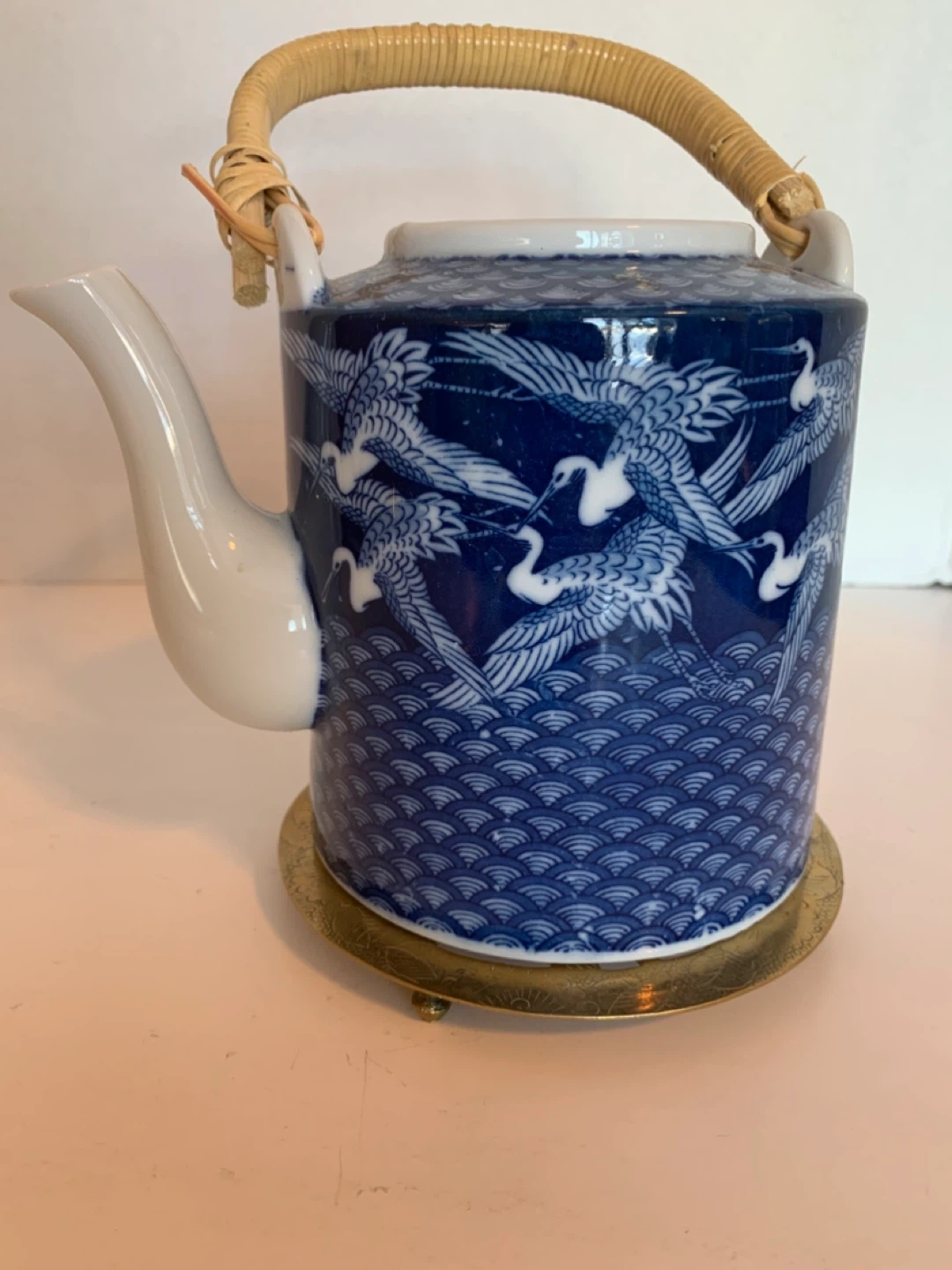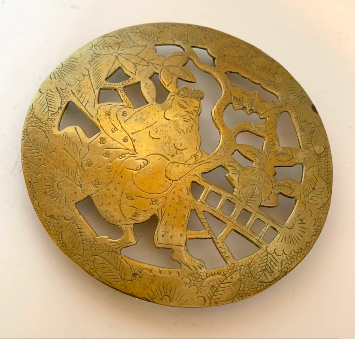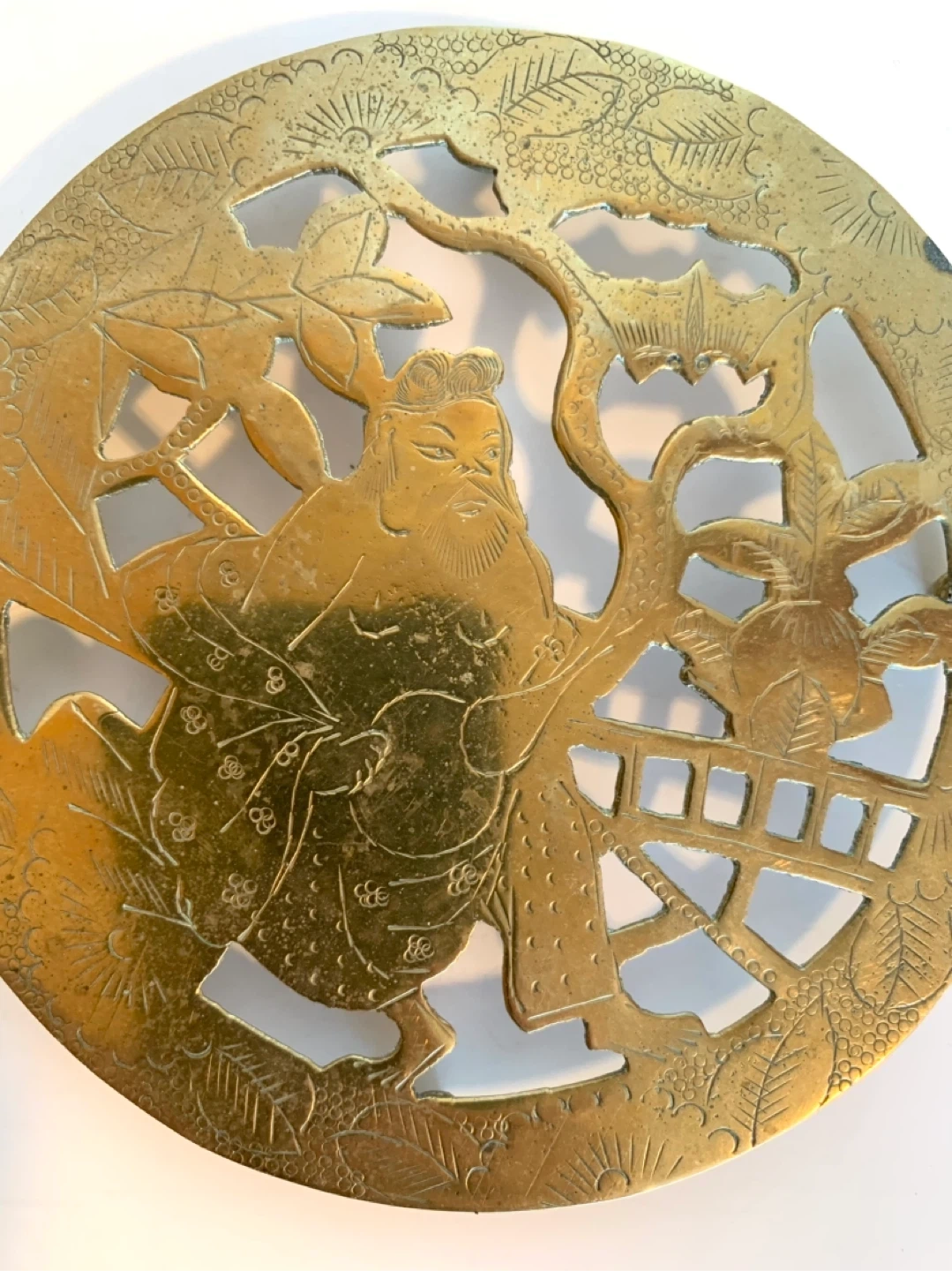 This is a decorative brass trivet featuring an intricate design of a Japanese warrior. It has a beautiful cut-out pattern that's very eye-catching. Great for protecting surfaces from hot dishes. Could be polished into a beautiful lustre.