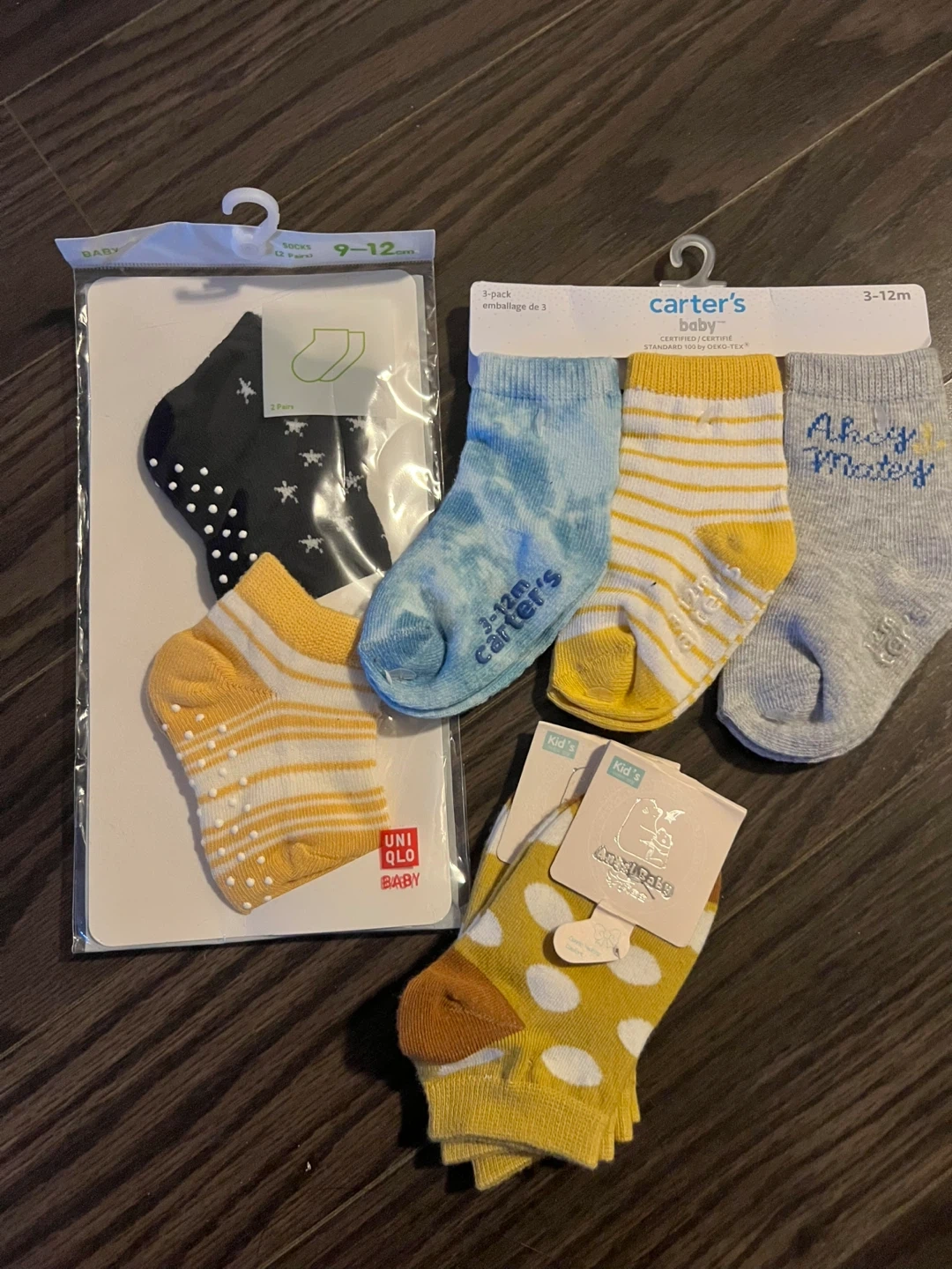 A mix of baby socks from Carter's and Uniqlo in size 9-12 months. Includes a 3-pack of Carter's socks with various patterns and a 2-pack of Uniqlo socks with grippers.