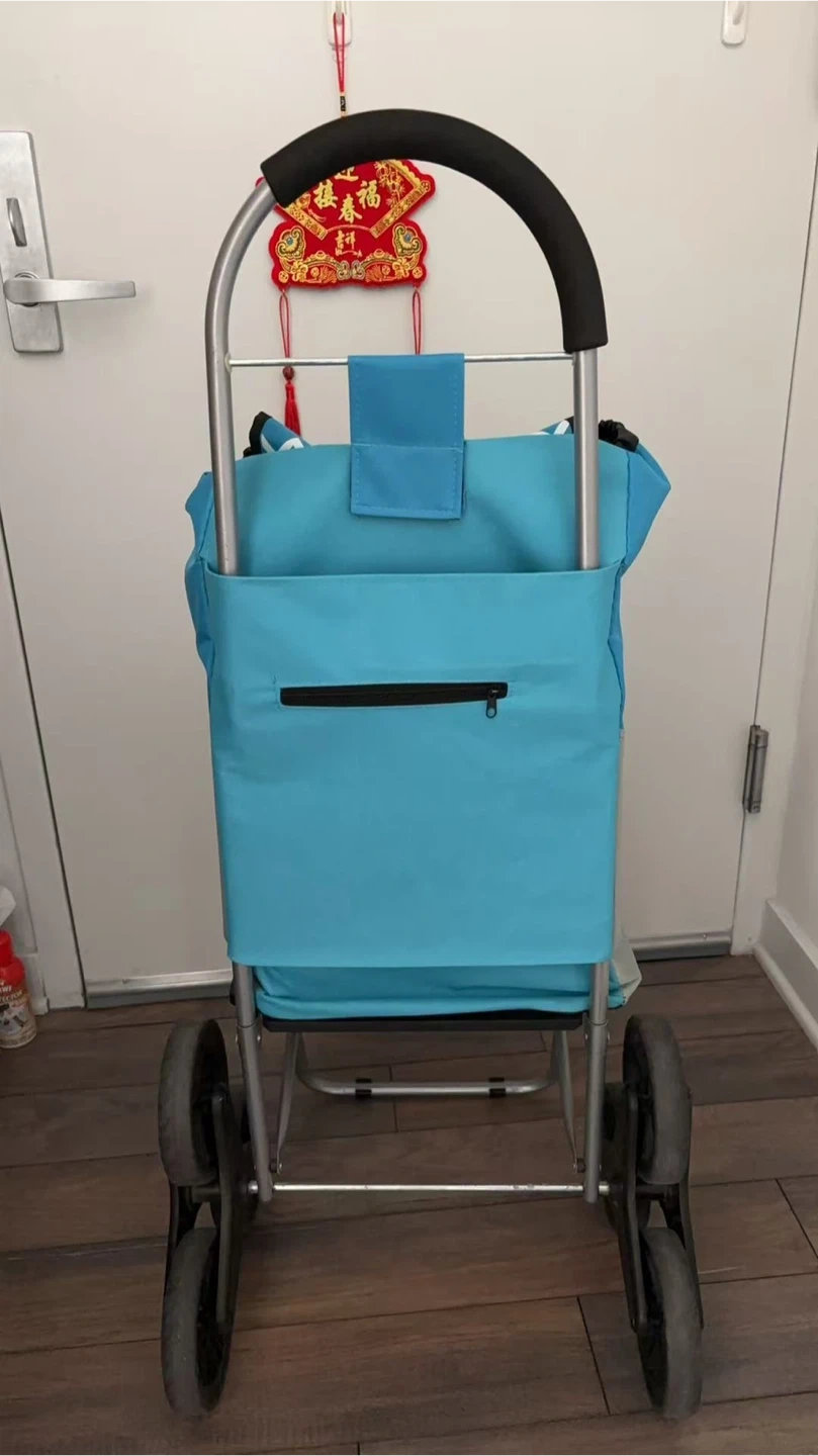 Convenient blue rolling shopping cart. It features a main compartment with a zippered front pocket. Durable metal frame with wheels for easy transport.