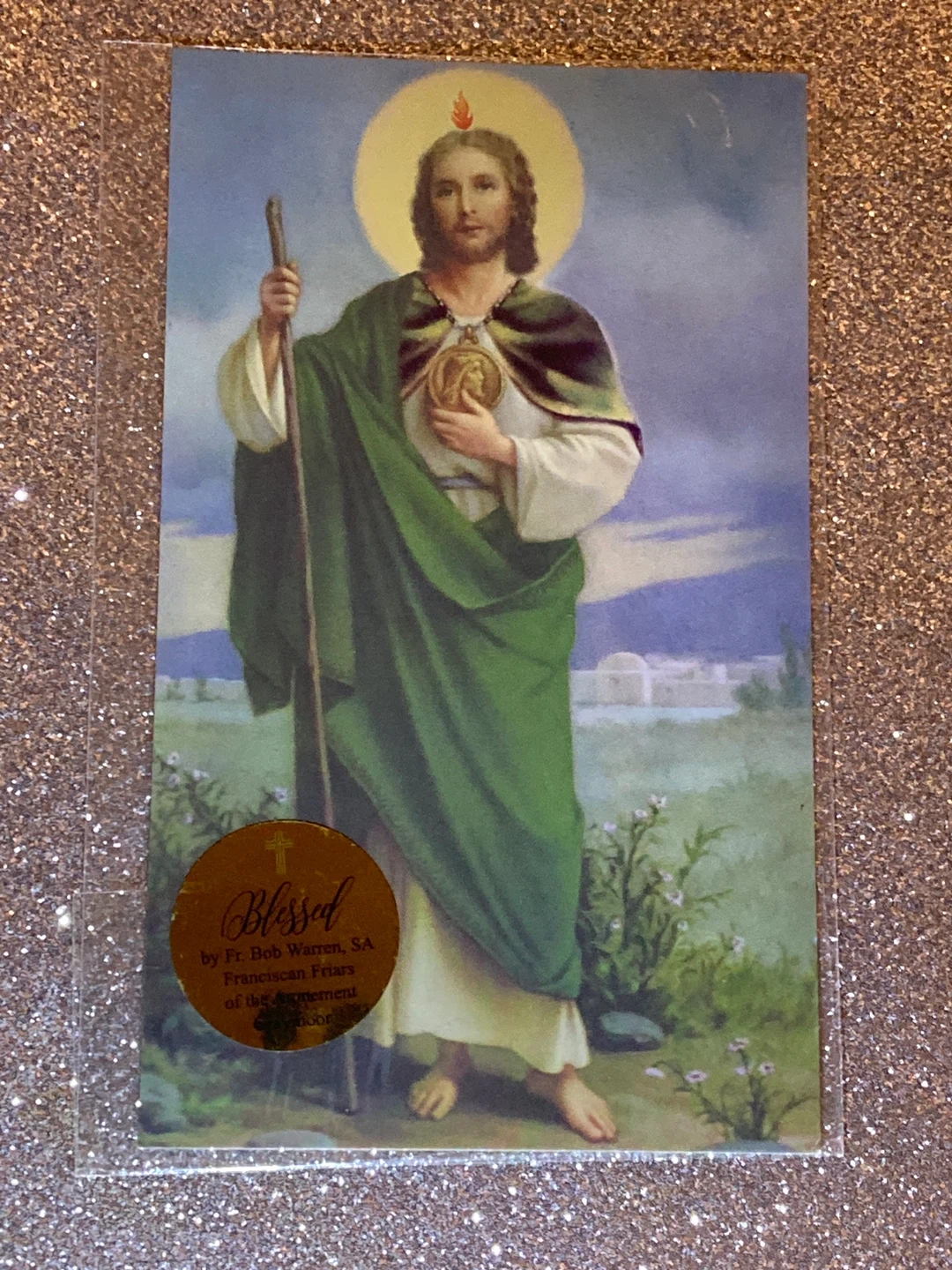 This is a blessed card featuring St. Jude, blessed by Fr. Bob Warren, SA, of the Franciscan Friars of the Atonement. The image depicts St. Jude holding his staff and a medallion. It's a spiritual item for personal devotion.