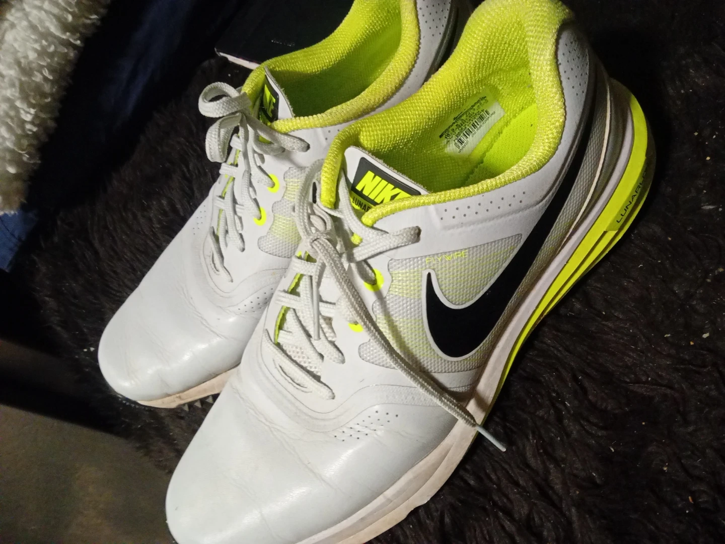 Nike Lunar Control golf shoes in white and volt. These shoes feature Flywire technology for support. They're designed for comfort and performance on the course. SIze 10.5