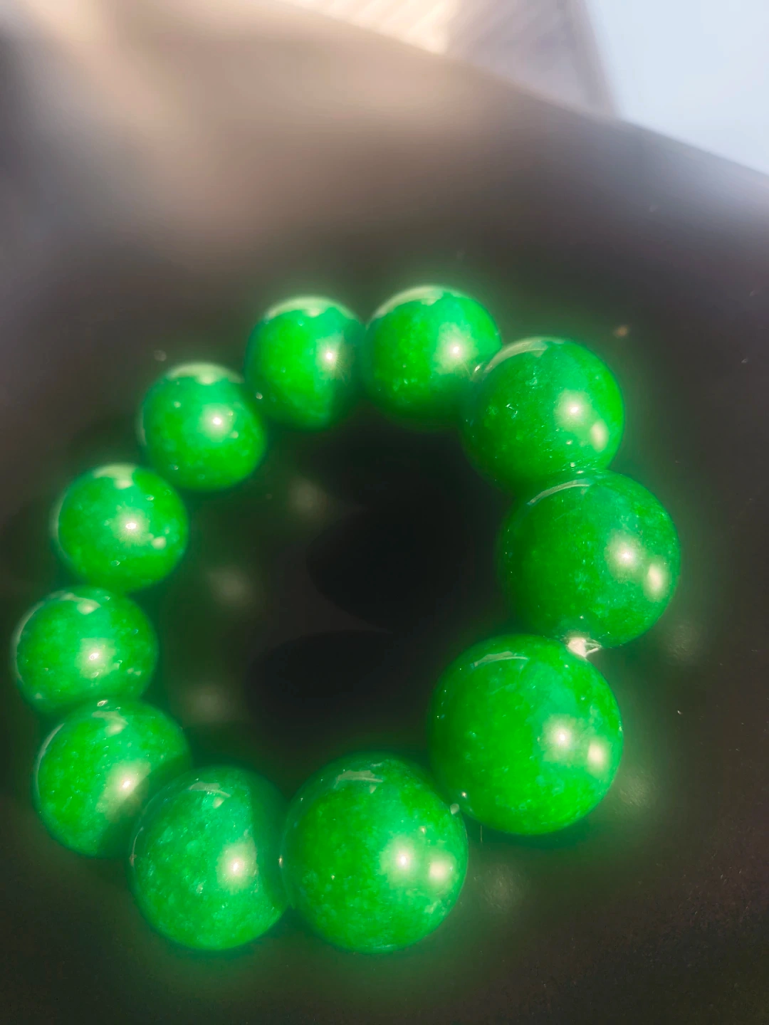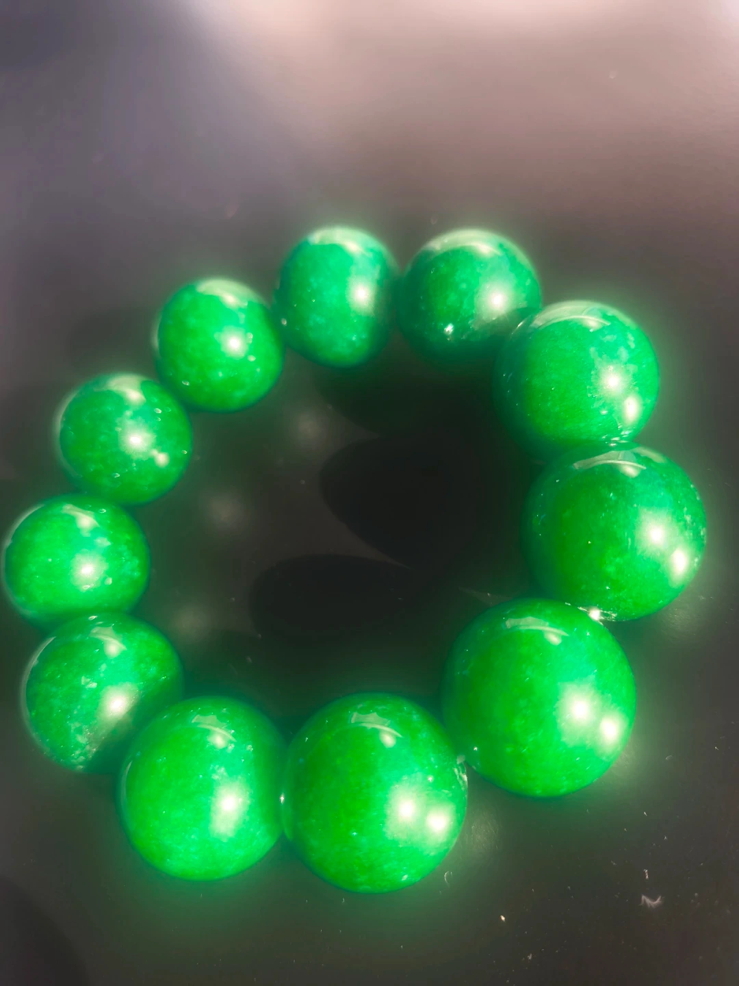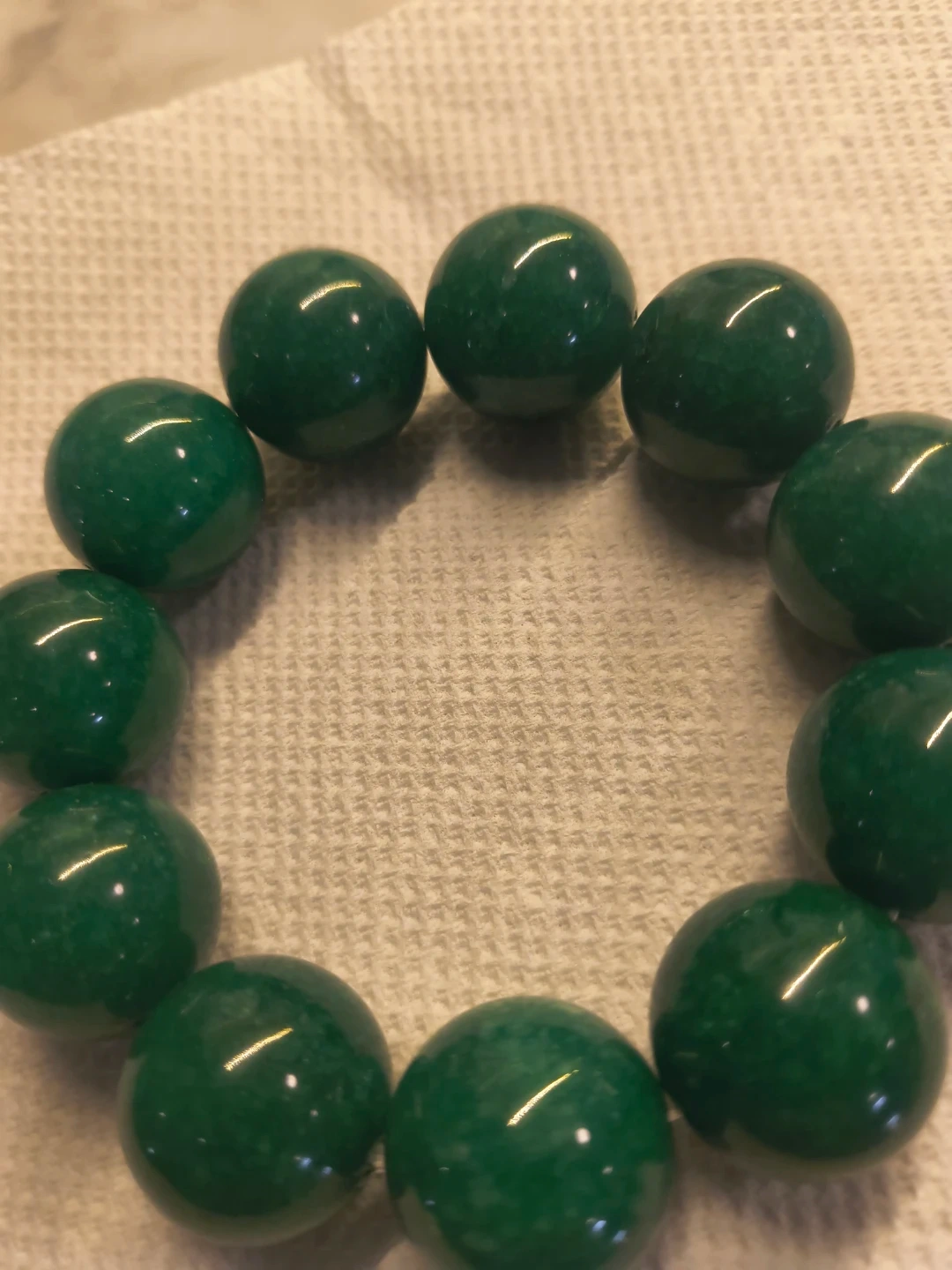This is a green beaded bracelet. It's made of polished stone beads. The beads are a deep emerald green color.