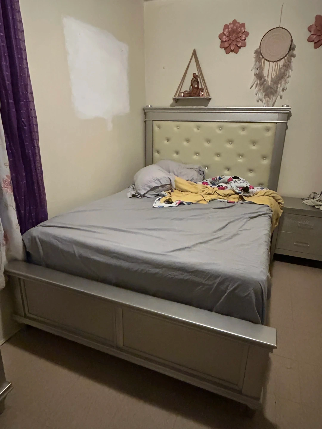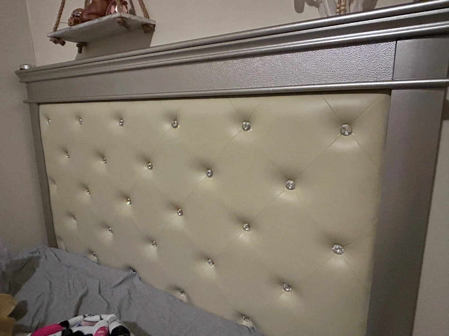 This bed frame features a silver-toned wood frame with a cream upholstered headboard. The headboard is tufted with clear rhinestones for a touch of sparkle. Includes the complete bed frame, box springs and headboard. Mattress not included.
