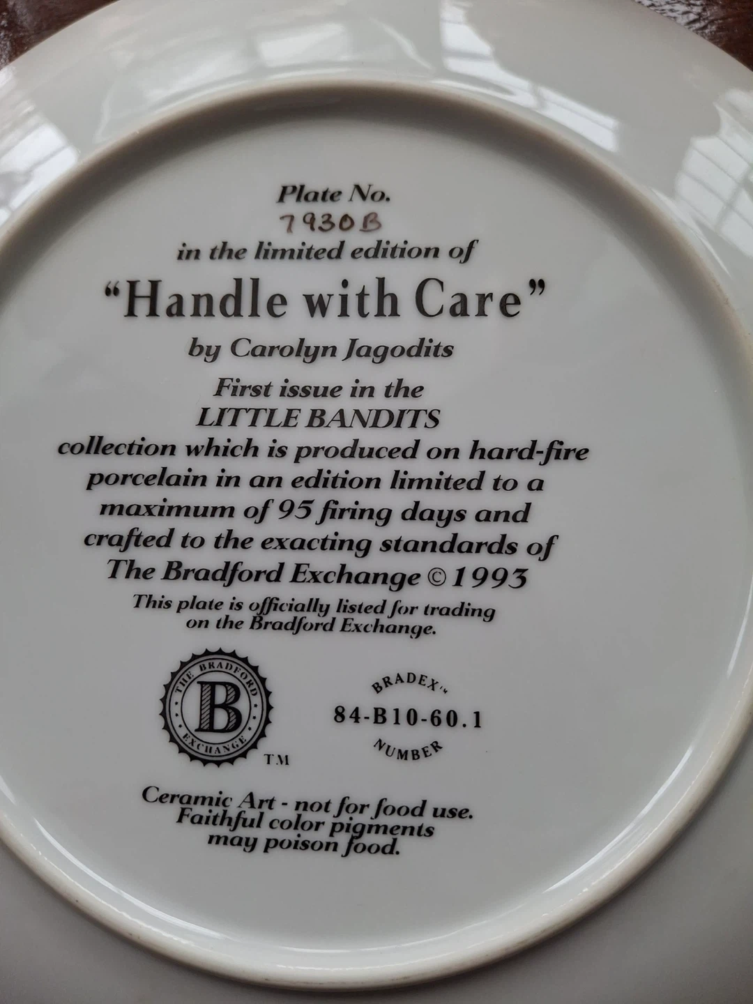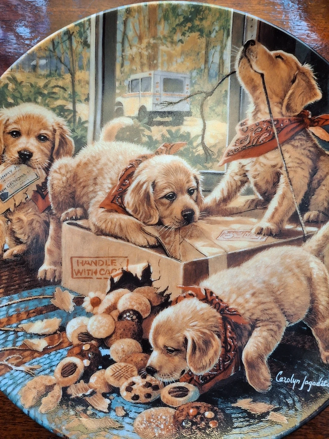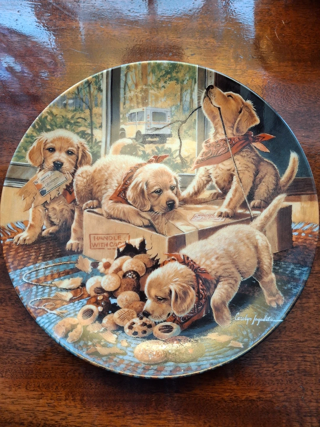 Decorative plate featuring 4 golden retriever puppies opening up a package. Plate is called "Handle with Care" - first issue in the Little Bandits series from Bradford Exchange. 11.5” across. Plate only (no stand)