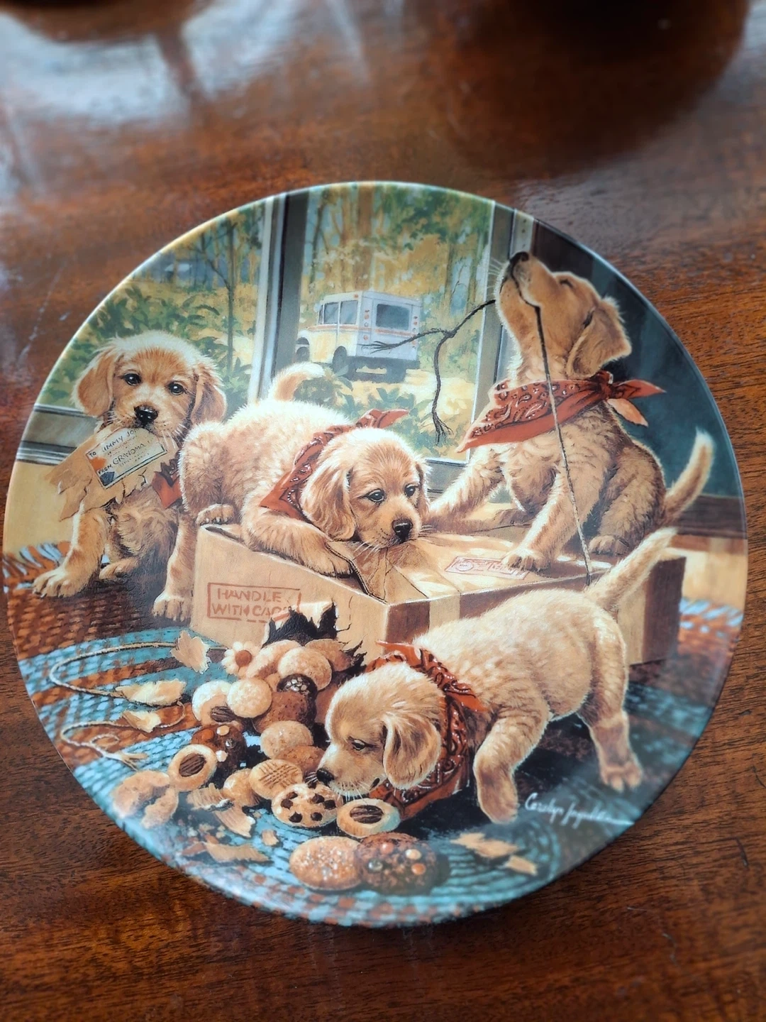 Decorative plate featuring 4 golden retriever puppies opening up a package. Plate is called "Handle with Care" - first issue in the Little Bandits series from Bradford Exchange. 11.5” across. Plate only (no stand)