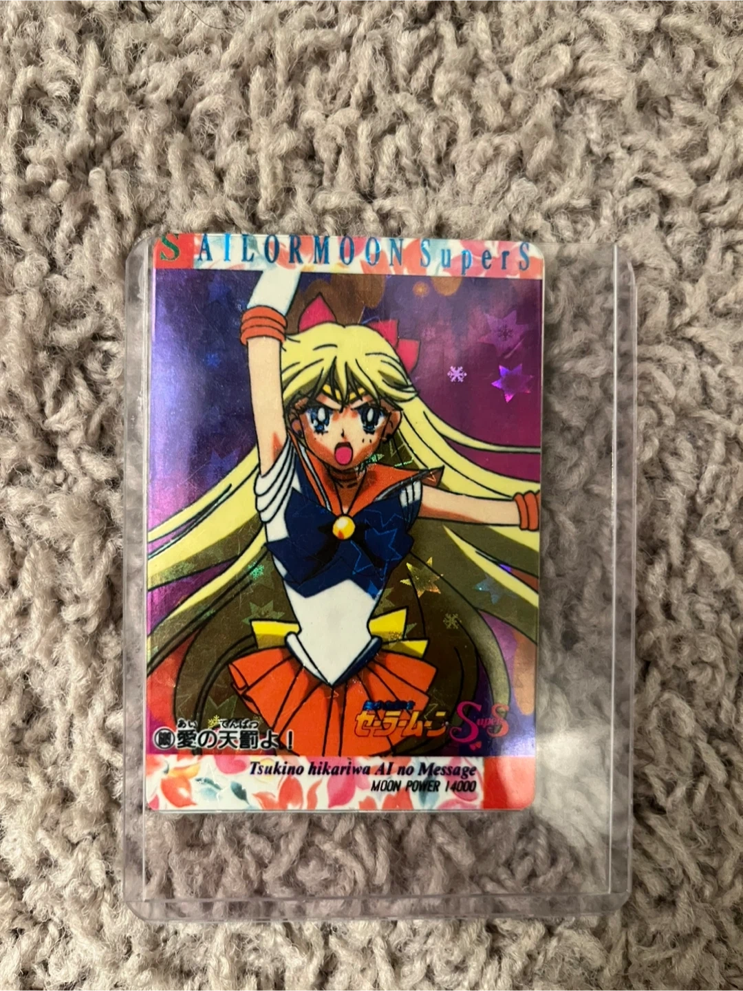 This is a Sailor Moon SuperS trading card featuring Venus. It reads 'Tsukino hikariwa AI no Message' and 'MOON POWER 14000'. It's a collectible item for fans of the series.