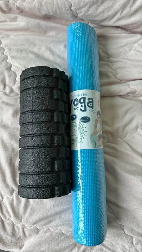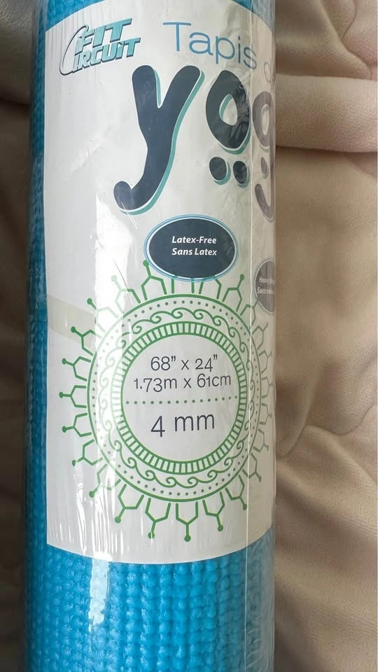 New FIT CIRCUIT yoga mat and foam roller set. Blue yoga mat is still in its plastic wrap. Mat dimensions are 68" x 24" (1.73m x 61cm) and 4 mm thick. It is latex-free and heavy metal free. Black foam roller is also new. Good for workouts or stretching.