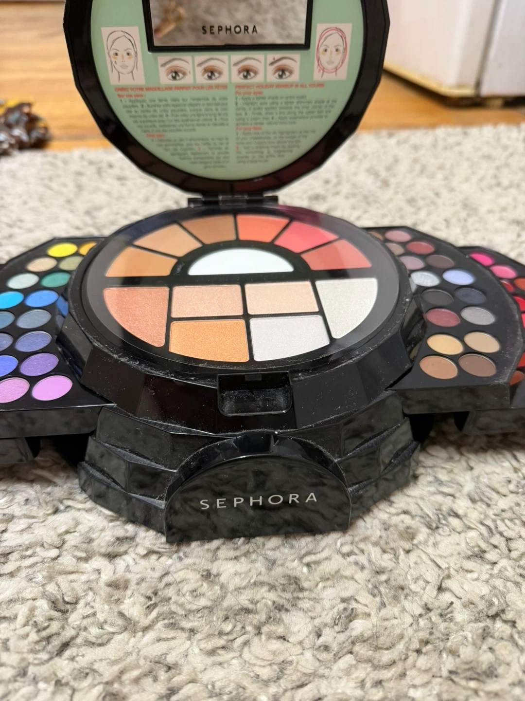 This Sephora makeup palette includes numerous eyeshadows, blushes, and highlighters. It's a comprehensive set for various makeup looks.