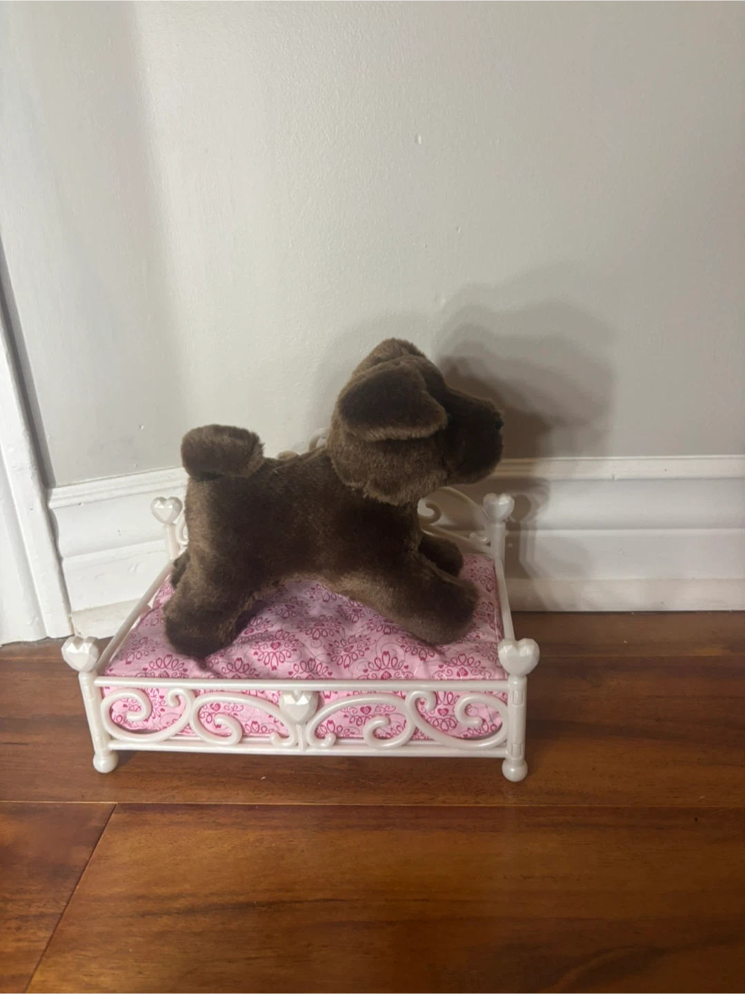 White doll dog bed with a pink patterned mattress. It's designed with heart details and a decorative headboard. This bed is perfect for small dolls or stuffed animals! ( Dog NOT included )