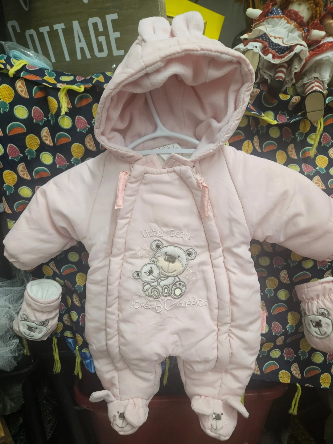 Keep your little one cozy in this adorable pink snowsuit. It features cute teddy bear embroidery and matching bunny ears on the hood. Perfect for keeping babies warm during colder months!