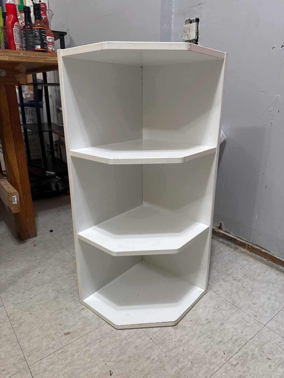 This is a white 3-tier corner shelf. It's made of wood. The dimensions are approximately 30 inches high and 12 inches on each side.