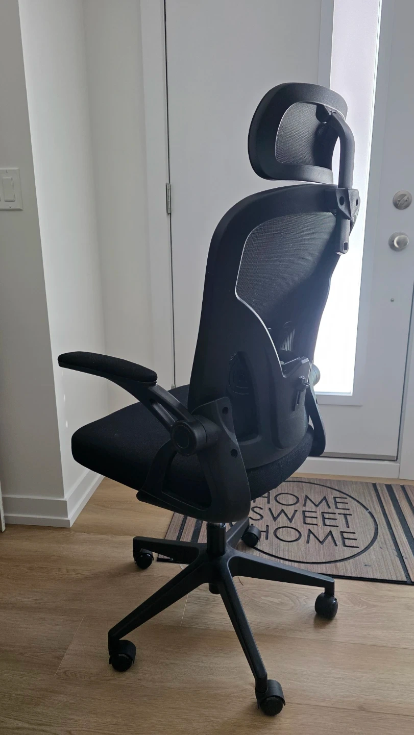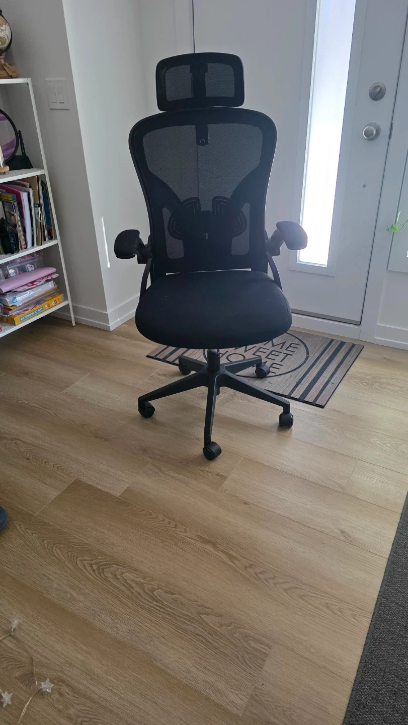 This ergonomic office chair features a breathable mesh back and adjustable headrest and back support for comfort. It has adjustable armrests and a sturdy base with casters for easy mobility. This chair is great for long work sessions at your desk!