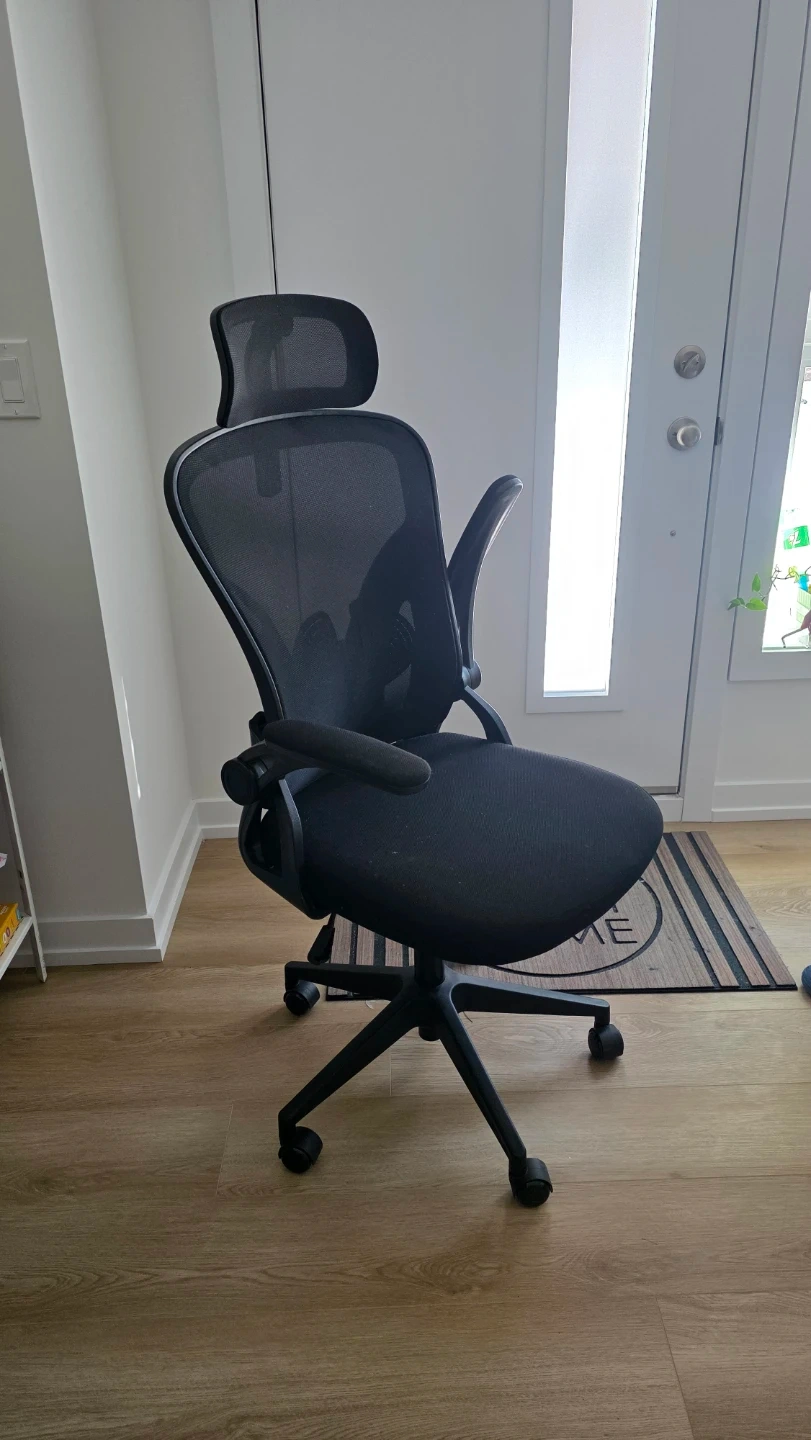 This ergonomic office chair features a breathable mesh back and adjustable headrest and back support for comfort. It has adjustable armrests and a sturdy base with casters for easy mobility. This chair is great for long work sessions at your desk!