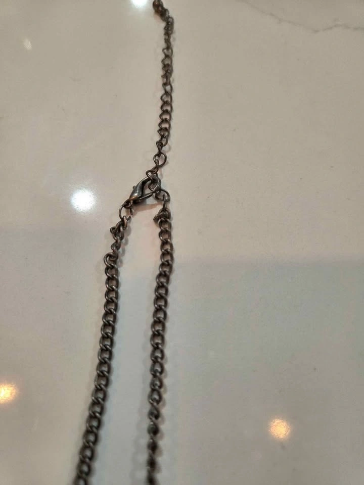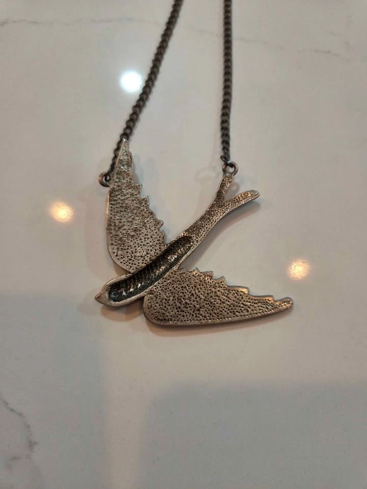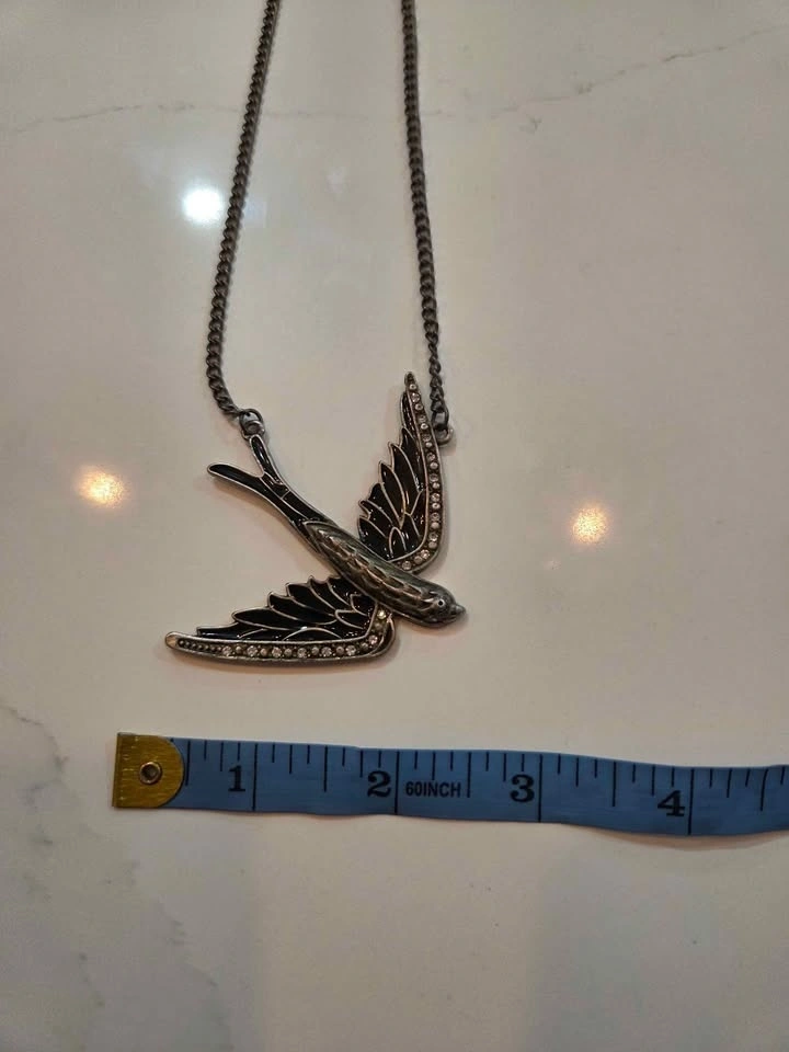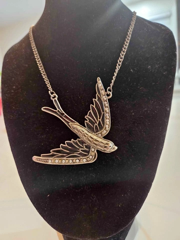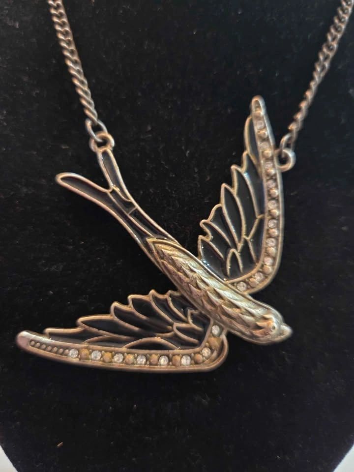 Beautiful bird necklace featuring a detailed bird in flight with crystal-accented wings. Antique gold tone finish with a solid chain. Eye-catching, artistic design that works well with both casual and dressy outfits. Very good pre-owned condition. From a smoke-free home. Pickup in Oshawa near Ritson and Hillcroft