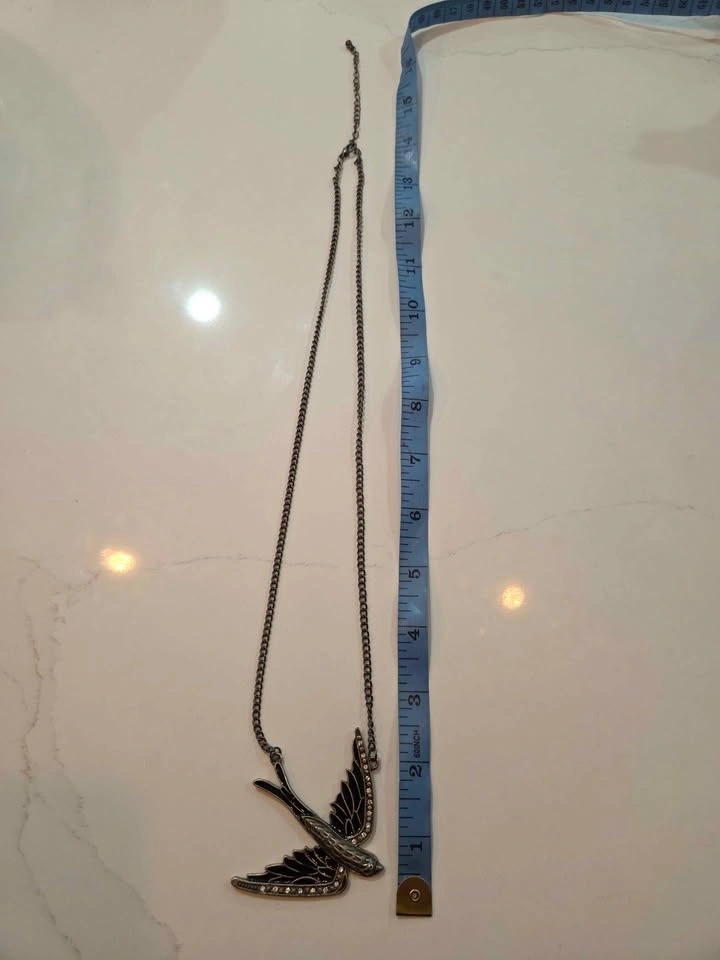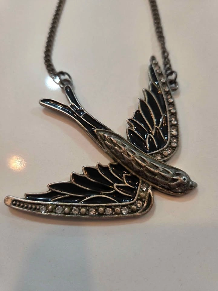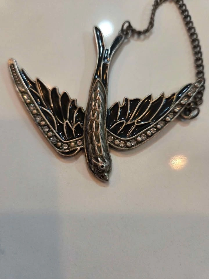 Beautiful bird necklace featuring a detailed bird in flight with crystal-accented wings. Antique gold tone finish with a solid chain. Eye-catching, artistic design that works well with both casual and dressy outfits. Very good pre-owned condition. From a smoke-free home. Pickup in Oshawa near Ritson and Hillcroft