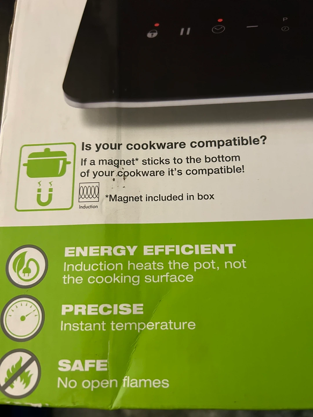 This cooktop is energy efficient and heats the pot, not the cooking surface. It features 10 cooking levels, a 3-hour timer with auto shut-off, and a keep warm function. It's also easy to clean because spills don't bake onto the surface. Brand new, never used.