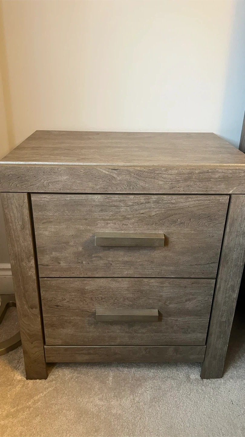King size bed with mattress and wooden dresser features a large, rustic-style mirror. It has six drawers for storage and a distressed wood finish. The top surface is ample for displaying decor or holding personal items.with 2 nights stands