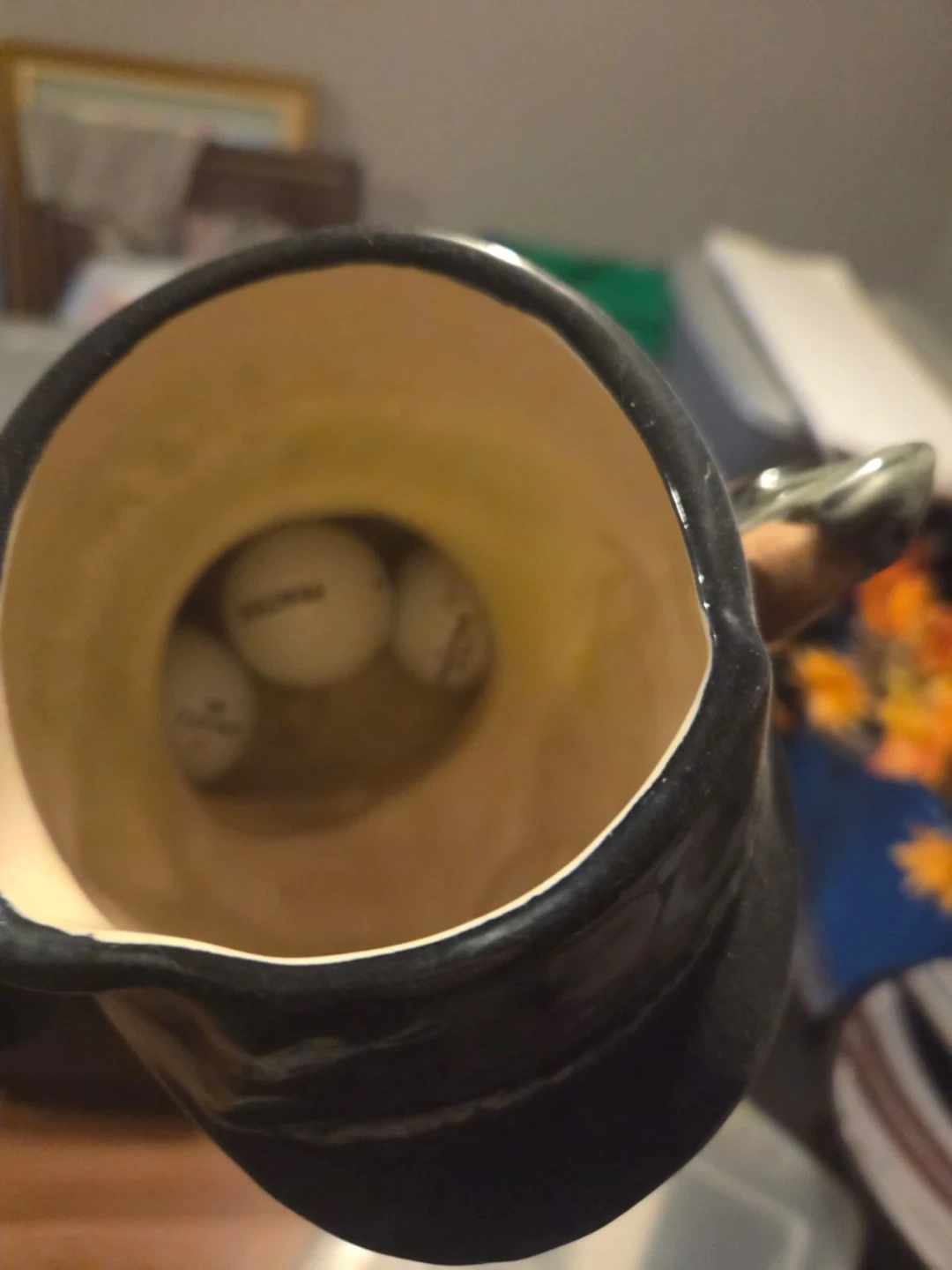 This unique pitcher is shaped like a golfer wearing a hat. It's made of ceramic and has a handle designed to look like a golf bag. It's a fun piece for any golf enthusiast! It's great for serving drinks or as a decorative item.