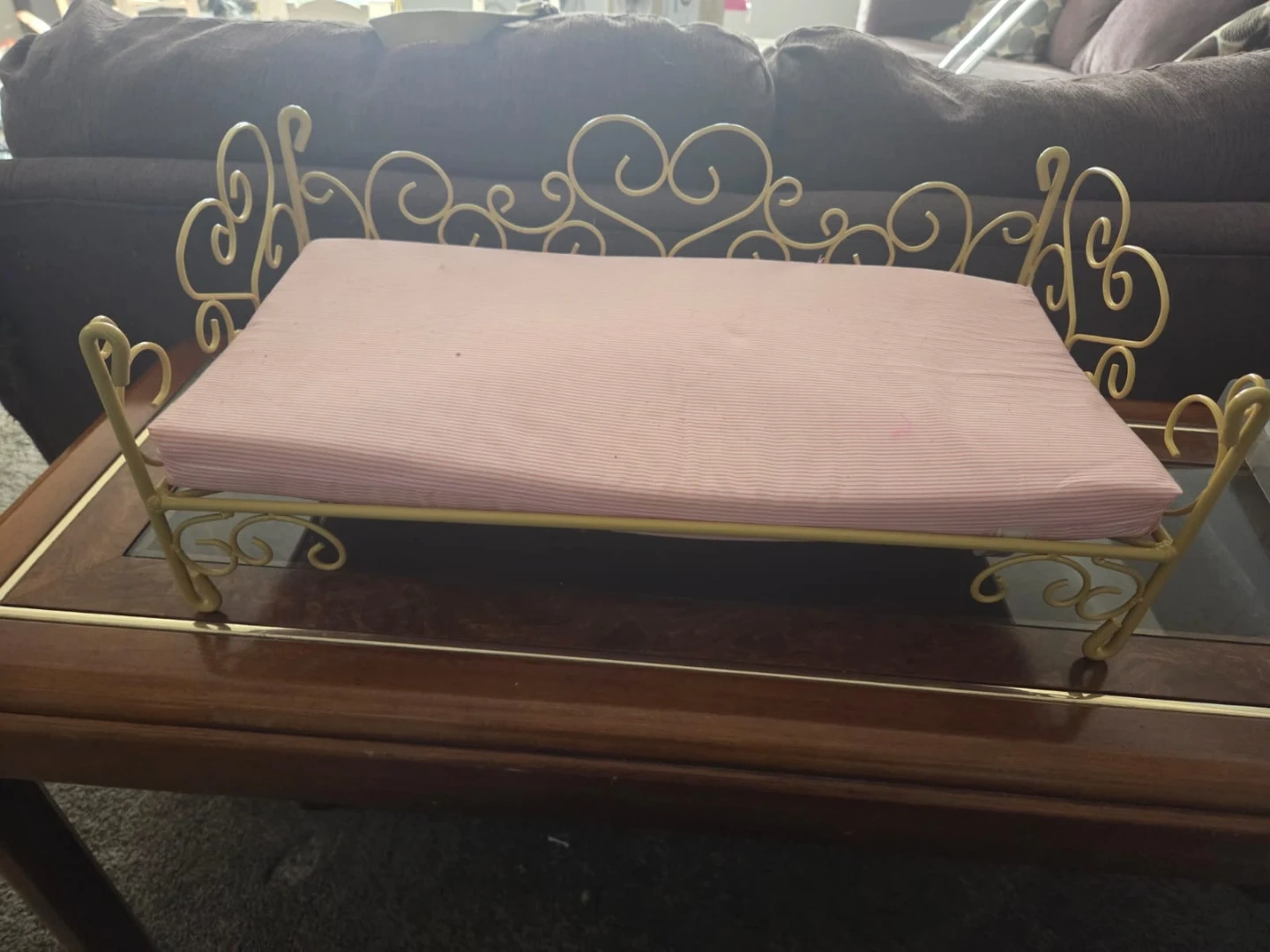 This decorative piece features a yellow metal frame with scrollwork and a pink striped cushion. It's approximately 18 inches long and 10 inches wide. Perfect for a small pet's napping spot, doll house, or displaying small decorative items!