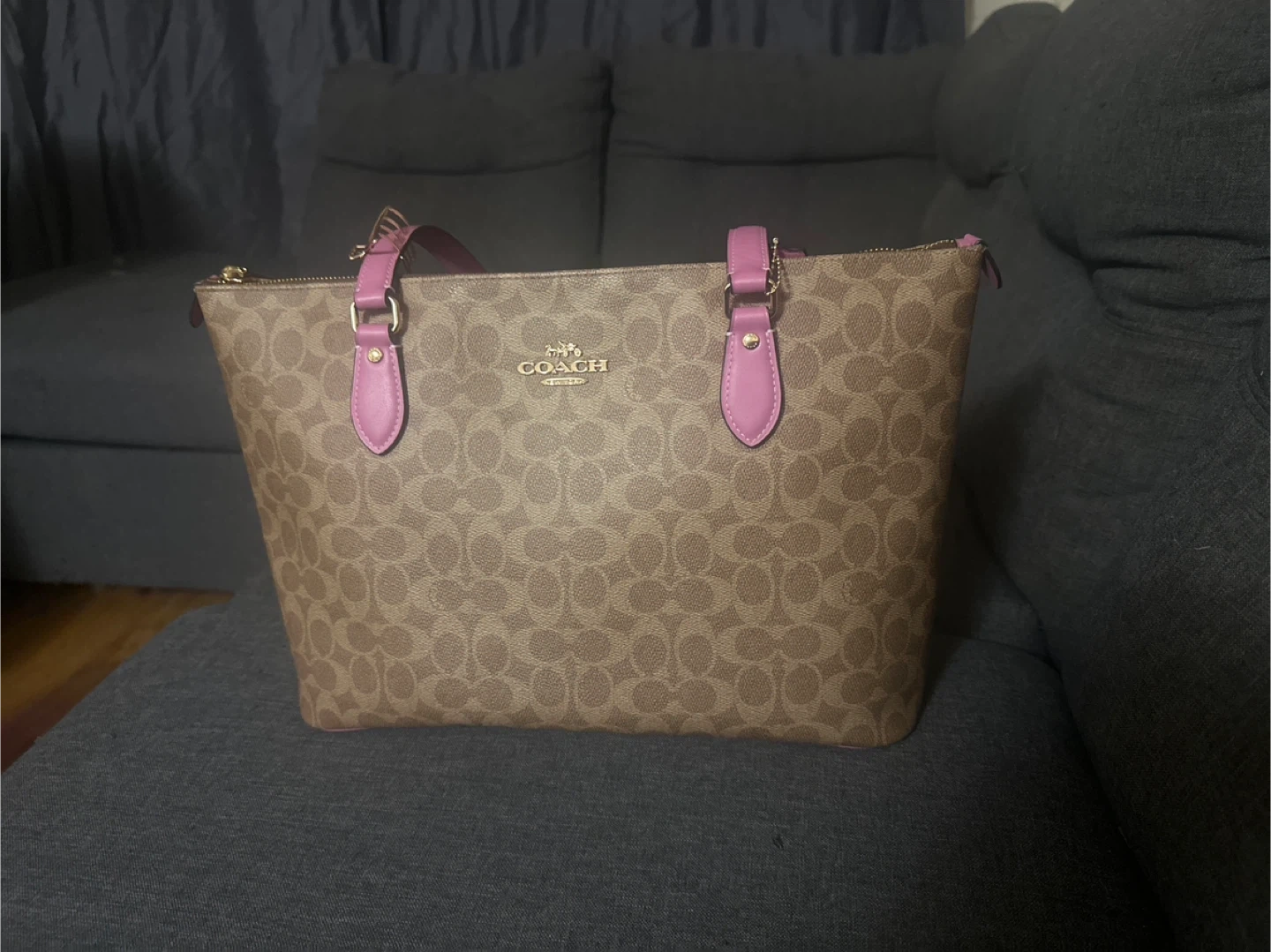 This is a Coach tote bag with the signature C monogram pattern. It features pink leather trim and handles. It's a stylish and practical accessory for everyday use.