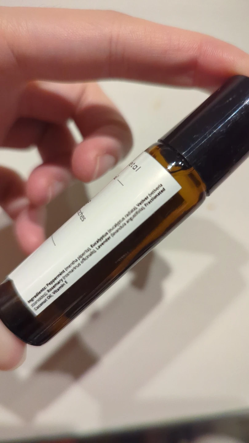 Fern & Petal all natural relief rollerball. It soothes headaches. Contains peppermint, eucalyptus, lavender, rosemary, vetiver, coconut oil, and Vitamin E. 10ml bottle.