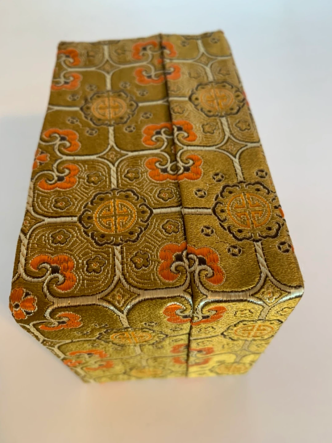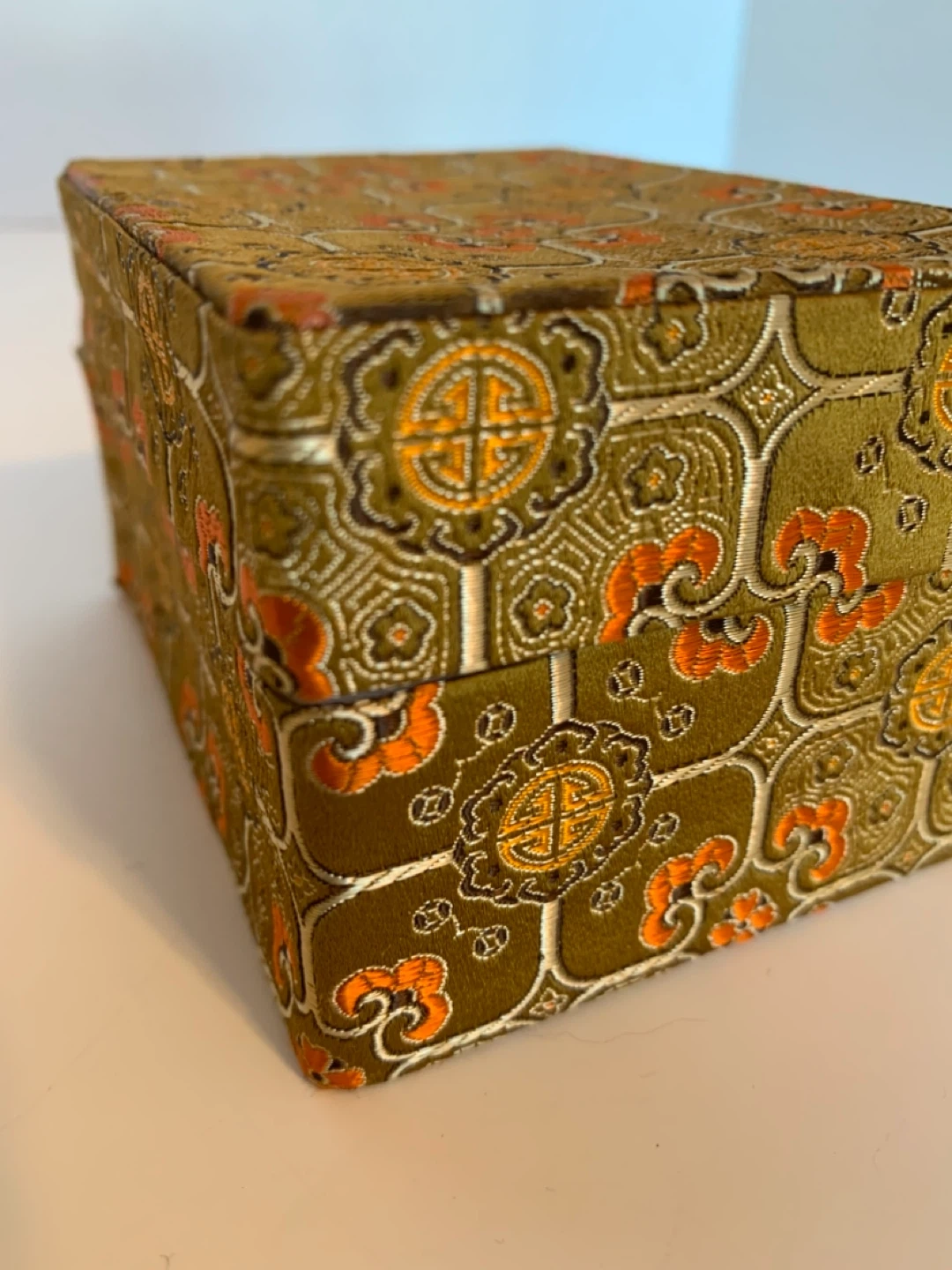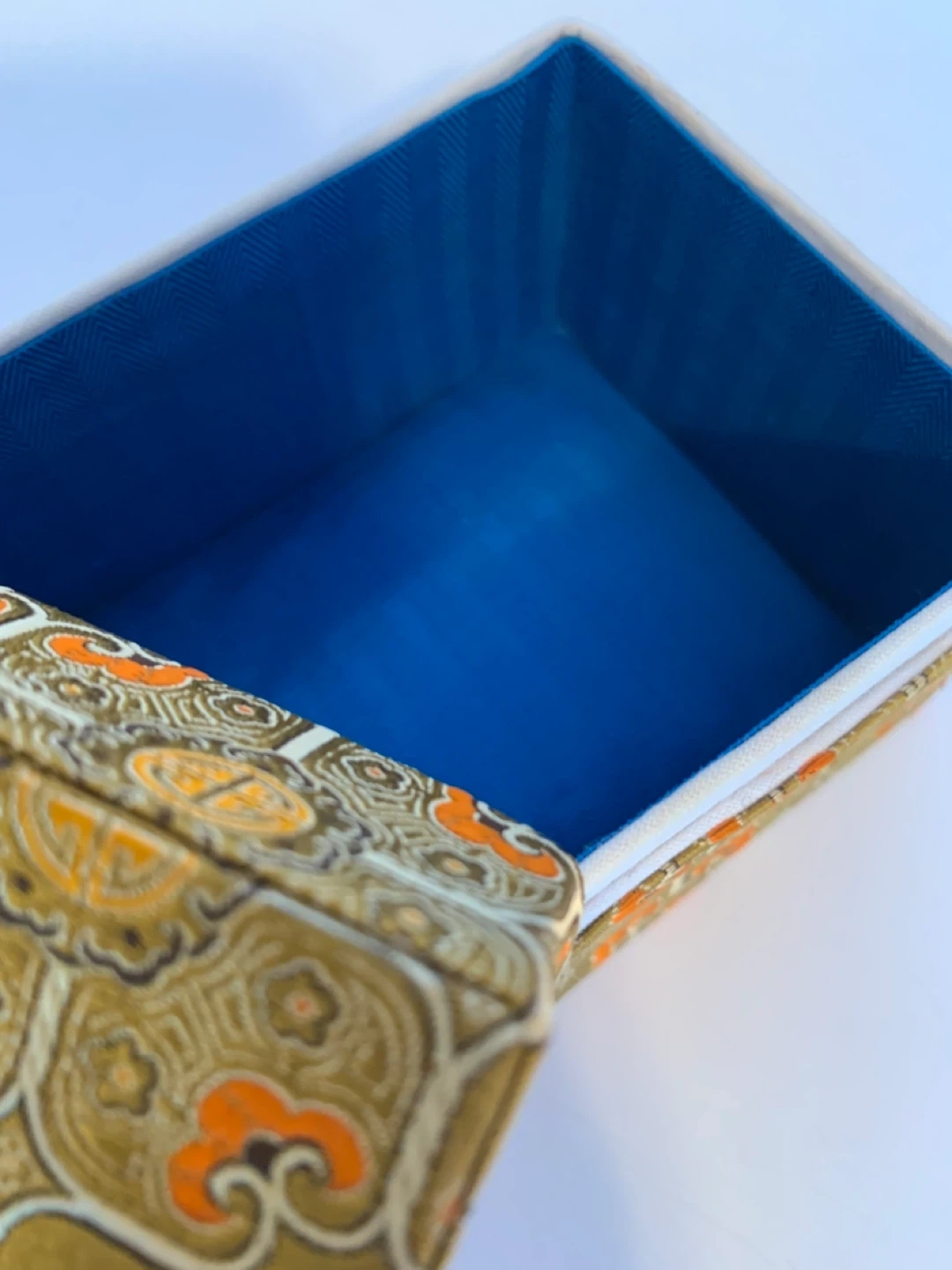 This is a decorative storage box with a patterned exterior in deep yellow, gold, orange and yellow and a blue fabric-lined interior. It's perfect for storing small items. The box has a detailed brocade-style fabric cover.