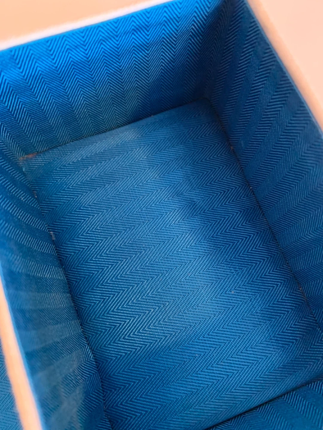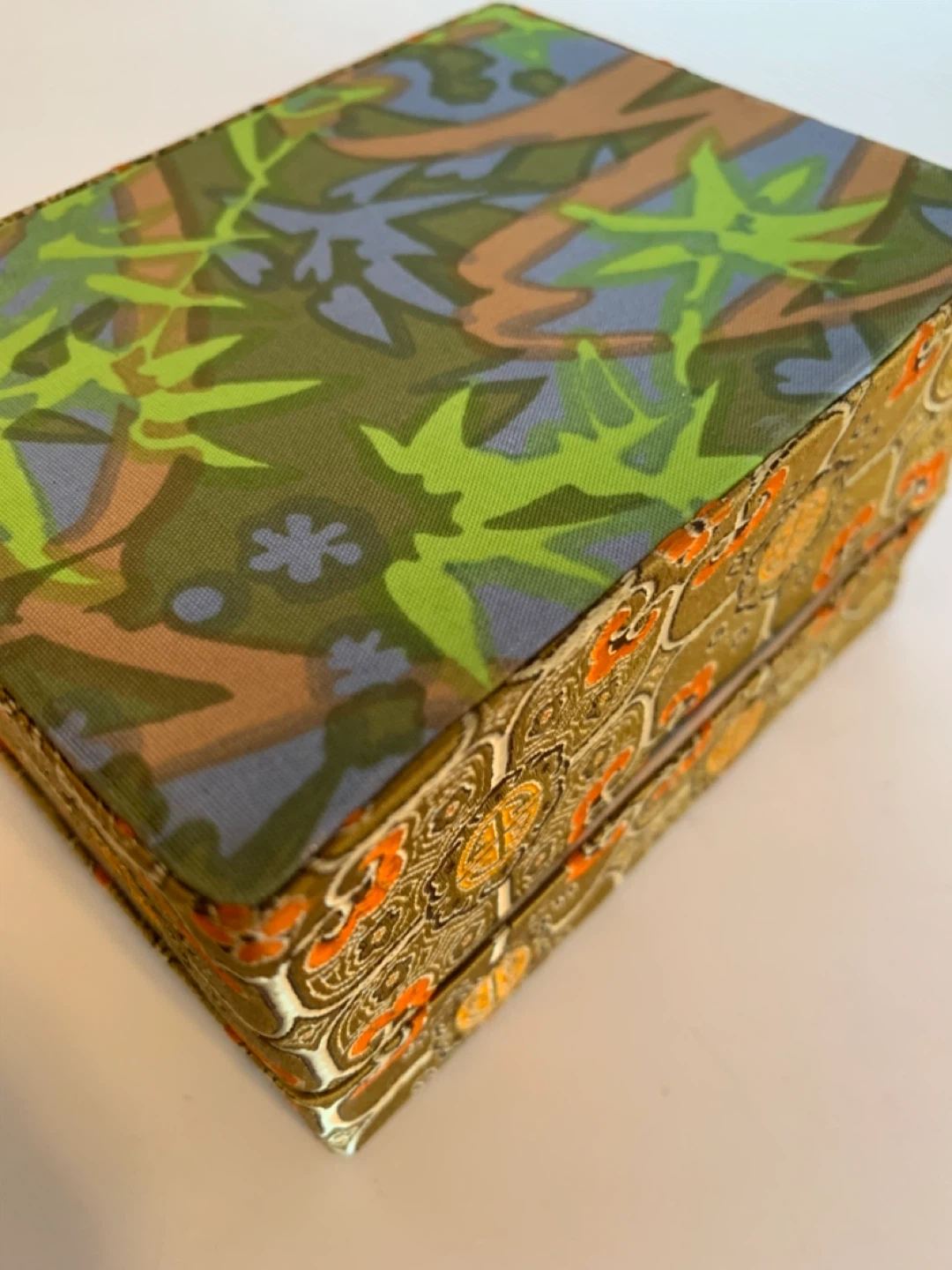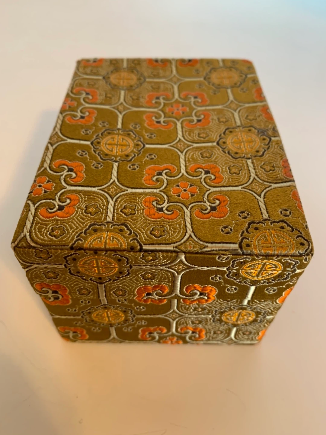 This is a decorative storage box with a patterned exterior in deep yellow, gold, orange and yellow and a blue fabric-lined interior. It's perfect for storing small items. The box has a detailed brocade-style fabric cover.