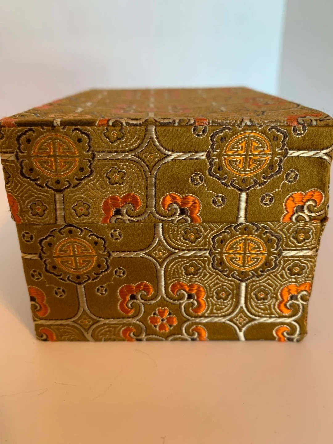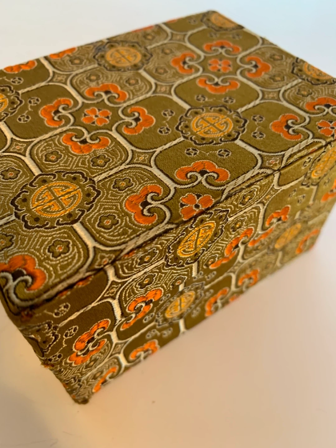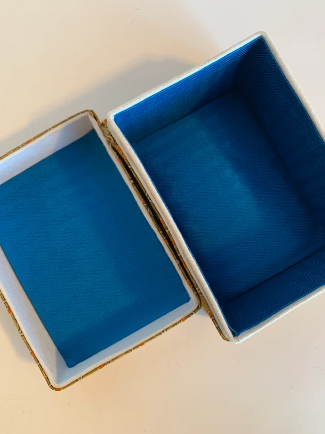 This is a decorative storage box with a patterned exterior in deep yellow, gold, orange and yellow and a blue fabric-lined interior. It's perfect for storing small items. The box has a detailed brocade-style fabric cover.