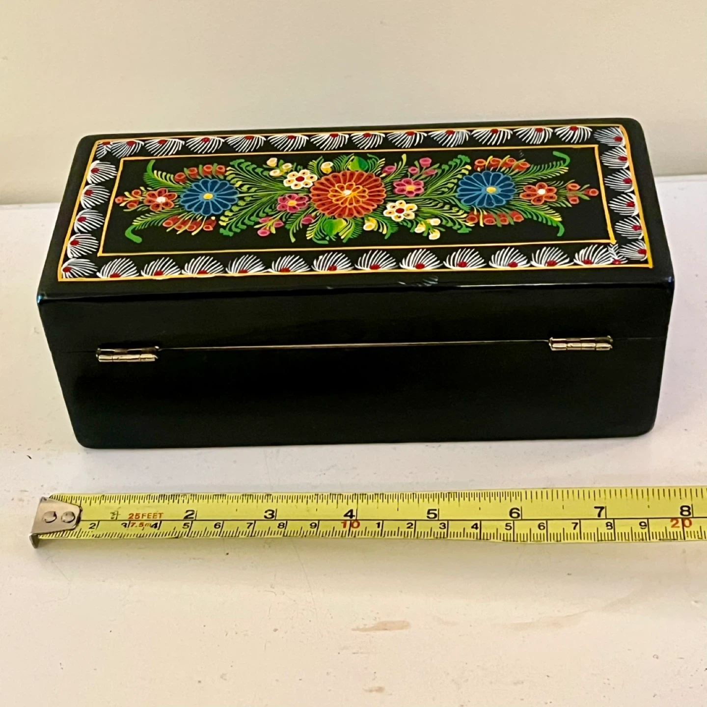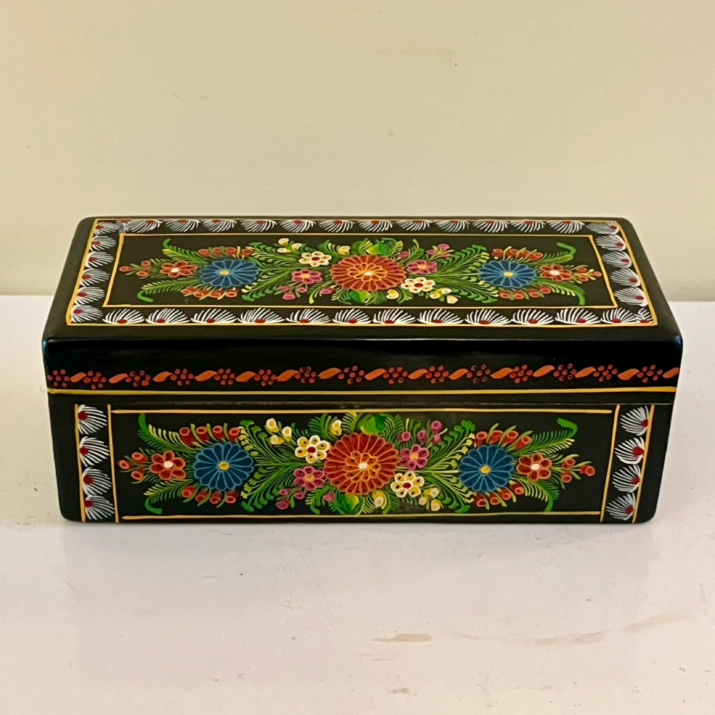 Hand-painted Mexican Olinalá lacquer box made from fragrant linaloe wood. These boxes are a renowned form of folk art from the town of Olinalá in Guerrero, Mexico, which is a major center for laquerware production.