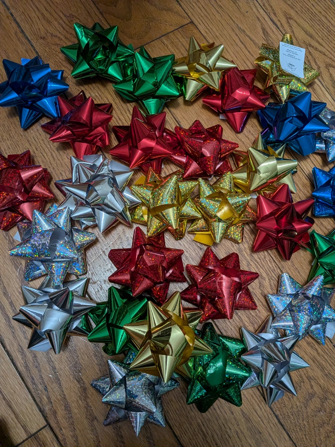 A collection of metallic gift bows in various colours. They're made of shiny material and are perfect for decorating presents. Comes with blue, green, red, silver, and gold bows.