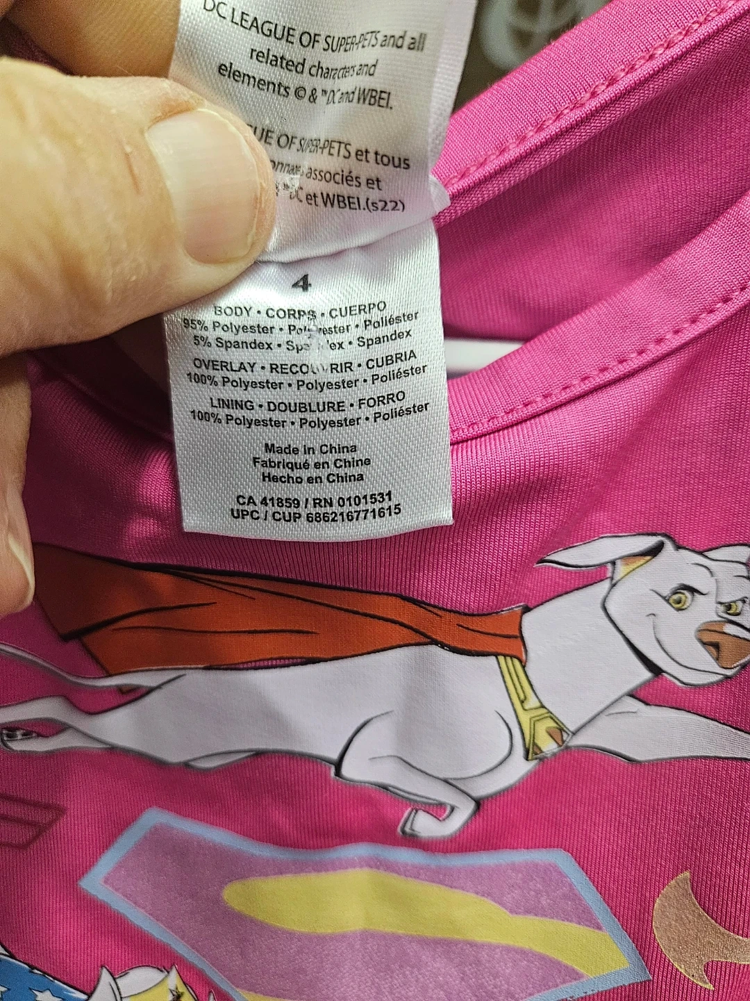 This pink dress features characters from DC League of Super-Pets! It's made with a polyester and spandex blend for comfort. The skirt has a sparkly overlay. This dress is size 4.