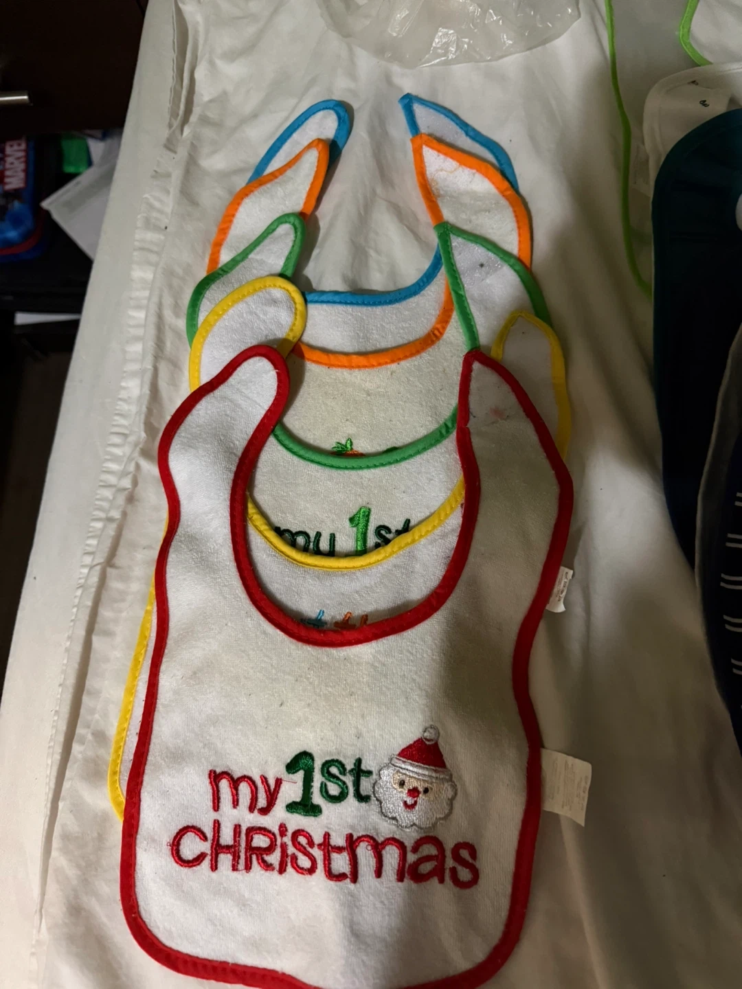 Set of baby bibs with "my 1st Christmas" embroidery and Santa graphic. Features colorful trim. These bibs are ideal for protecting a baby's clothes during meals.