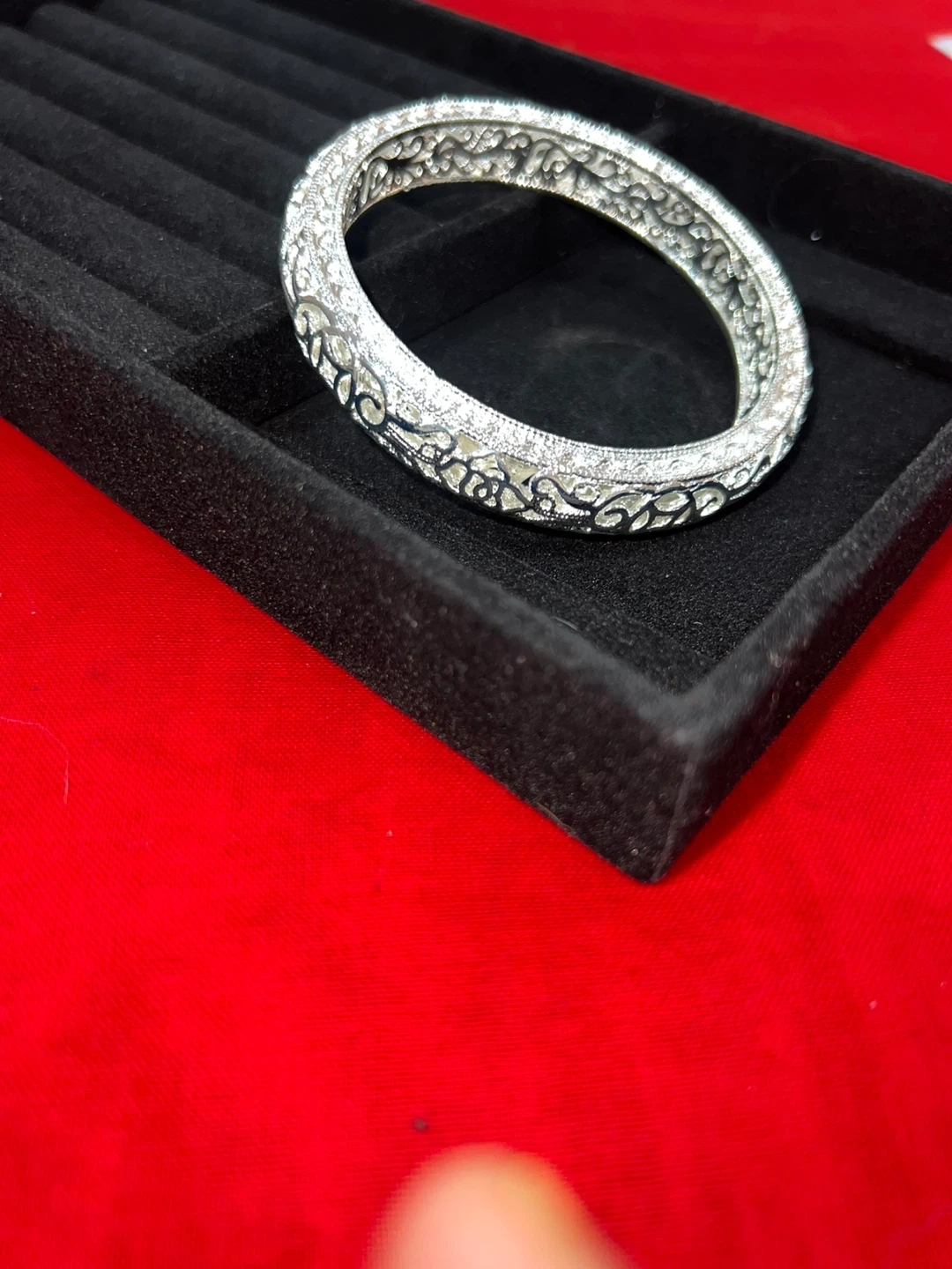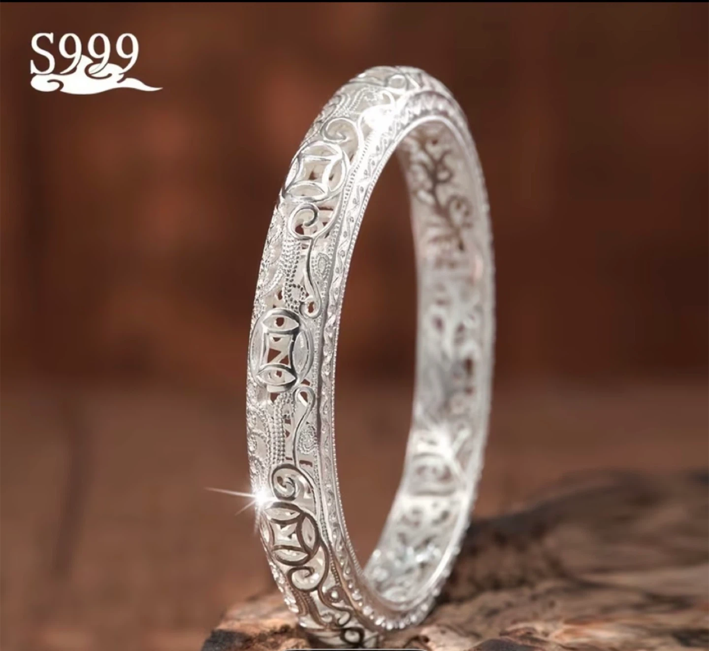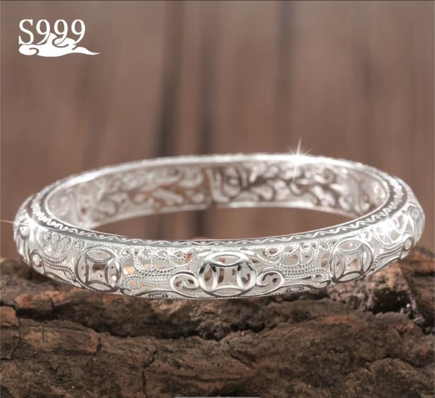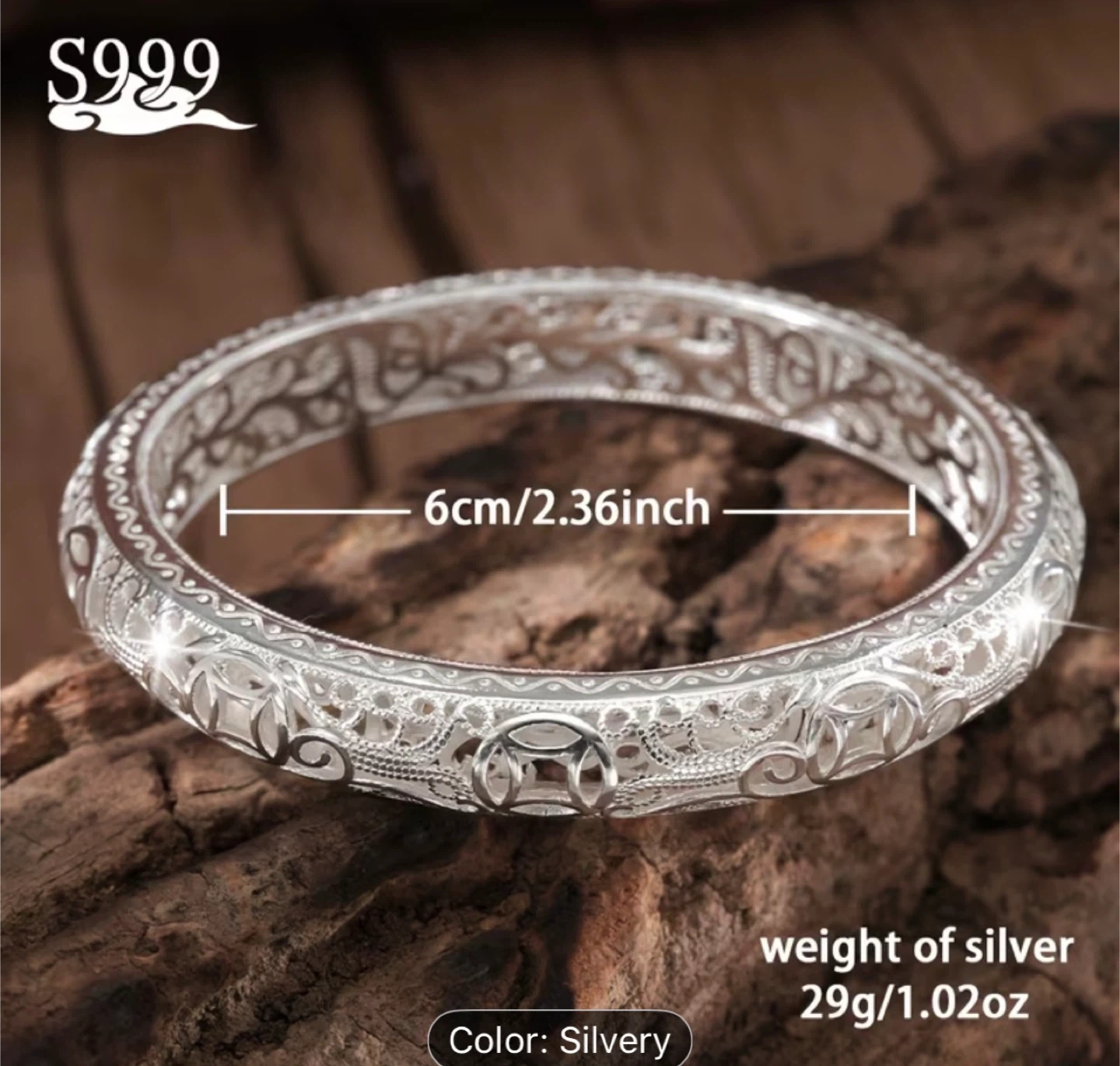 This is a beautiful S999 silver bangle bracelet. It features intricate filigree designs .The bracelet has a diameter of 6cm and a weight of 29g. It's made of pure silver.