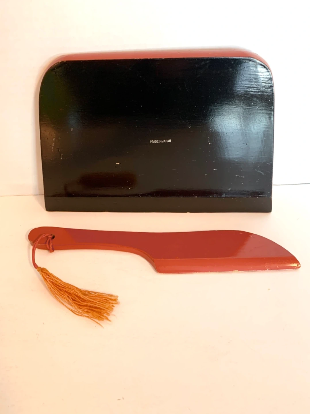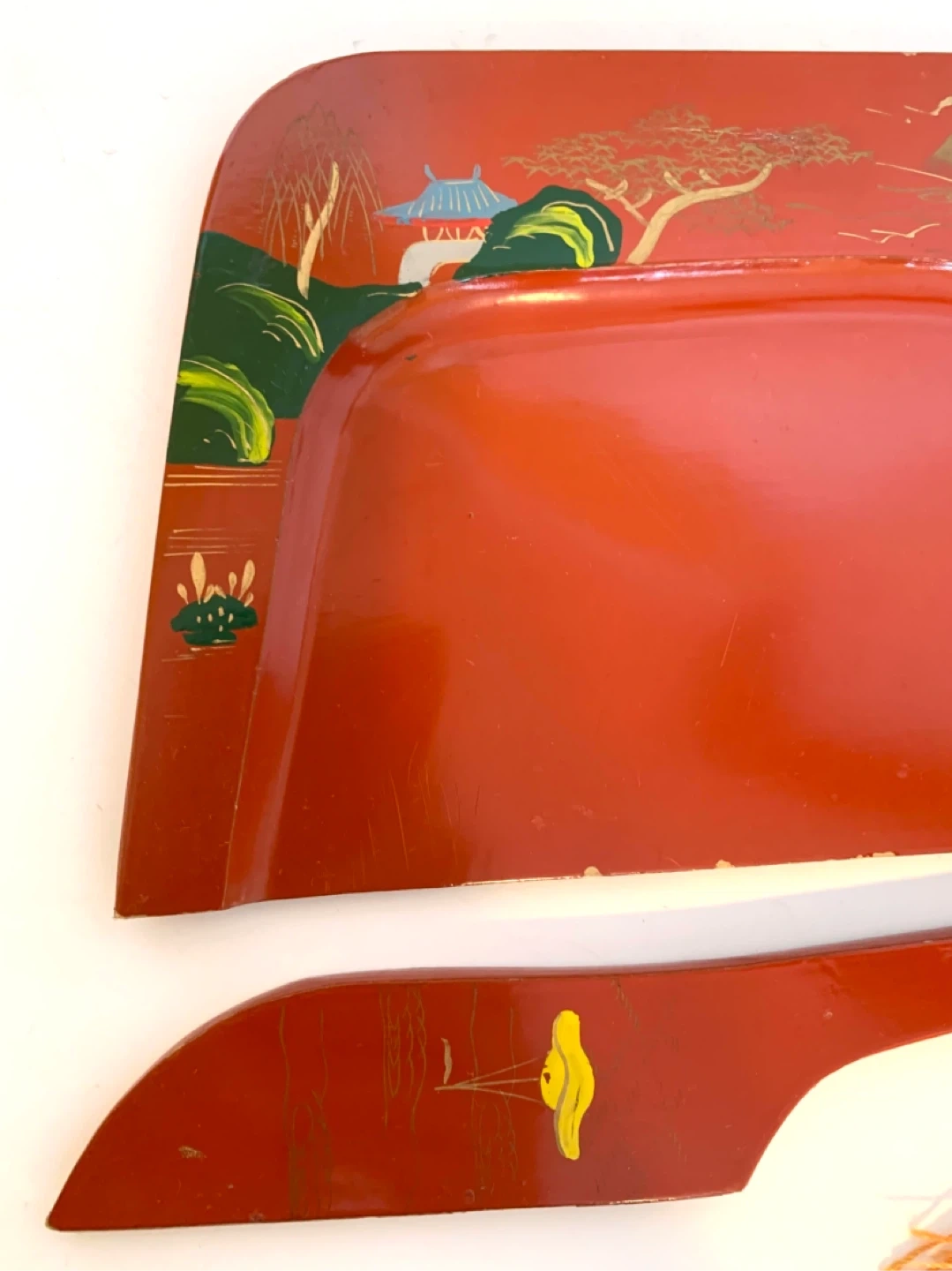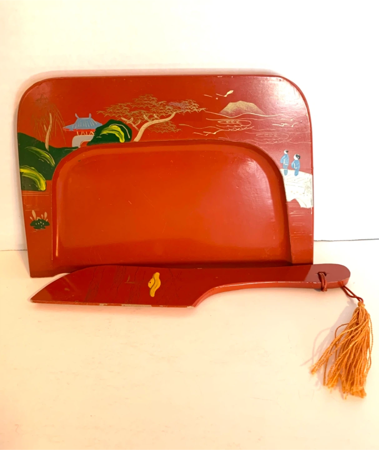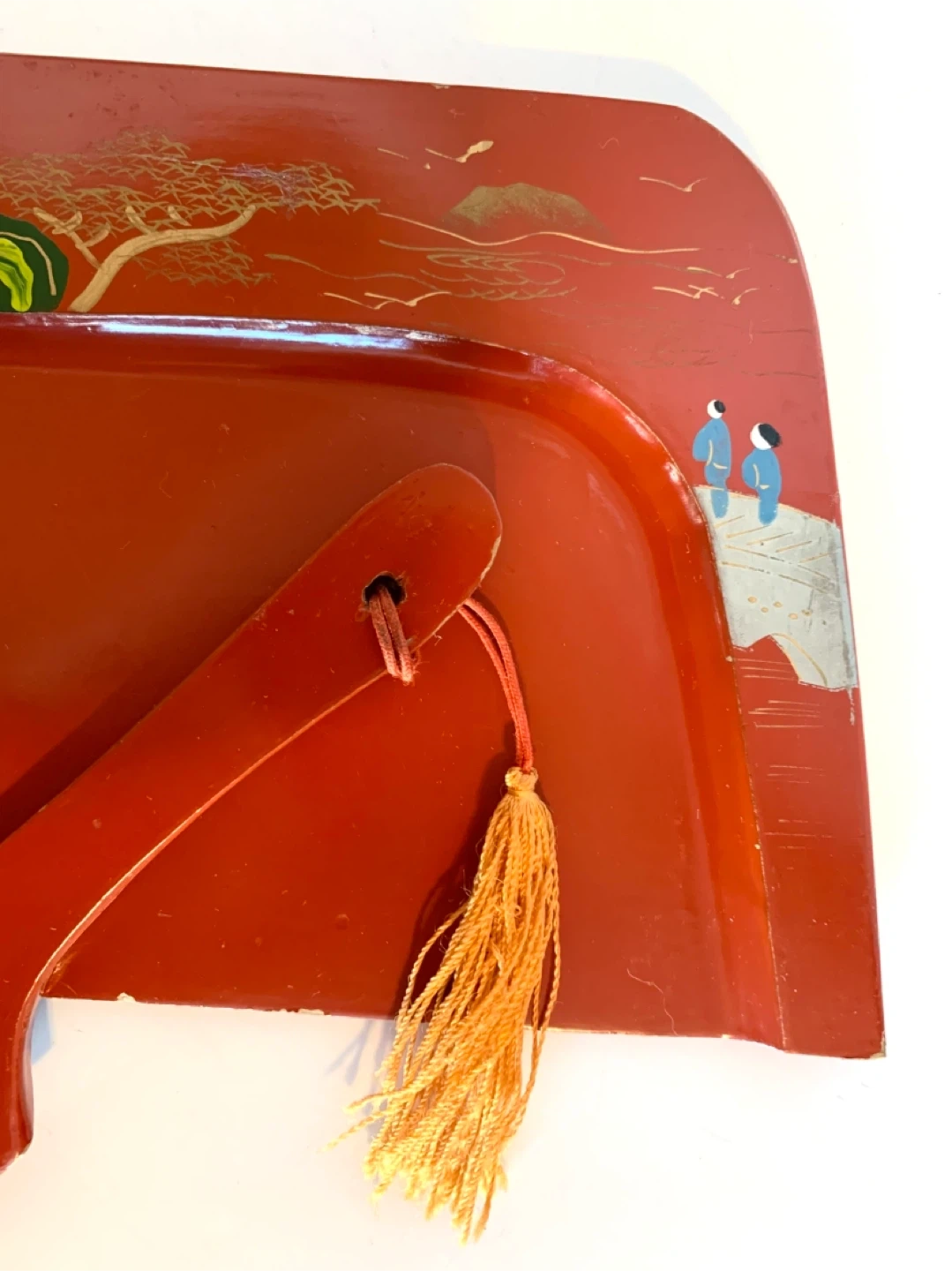 This is a decorative vintage dustpan and brush set. It's made of red lacquered wood with hand-painted Japanese-style scenery. The set includes a dustpan and a matching brush. An orange tassel hangs from the brush handle.