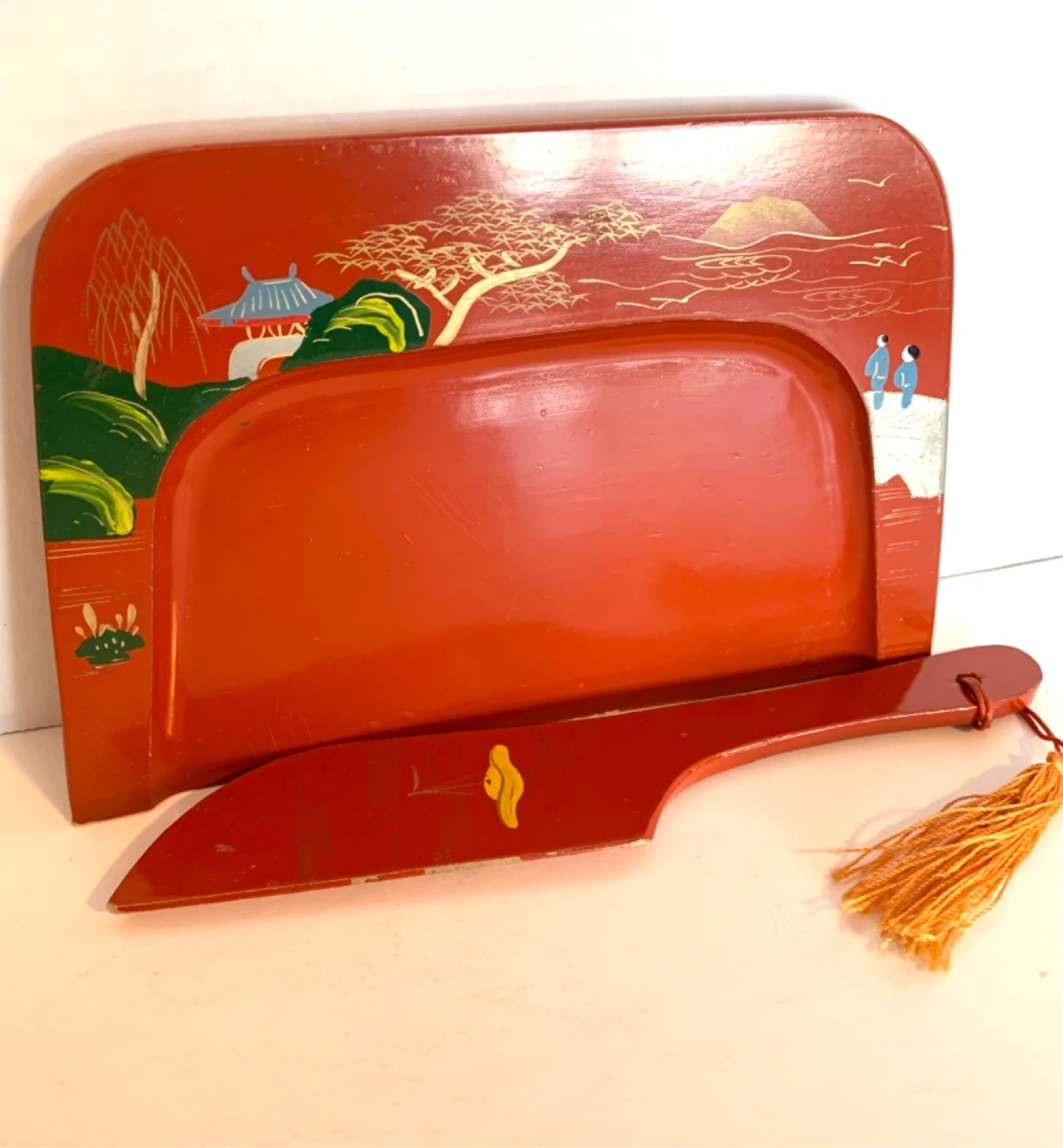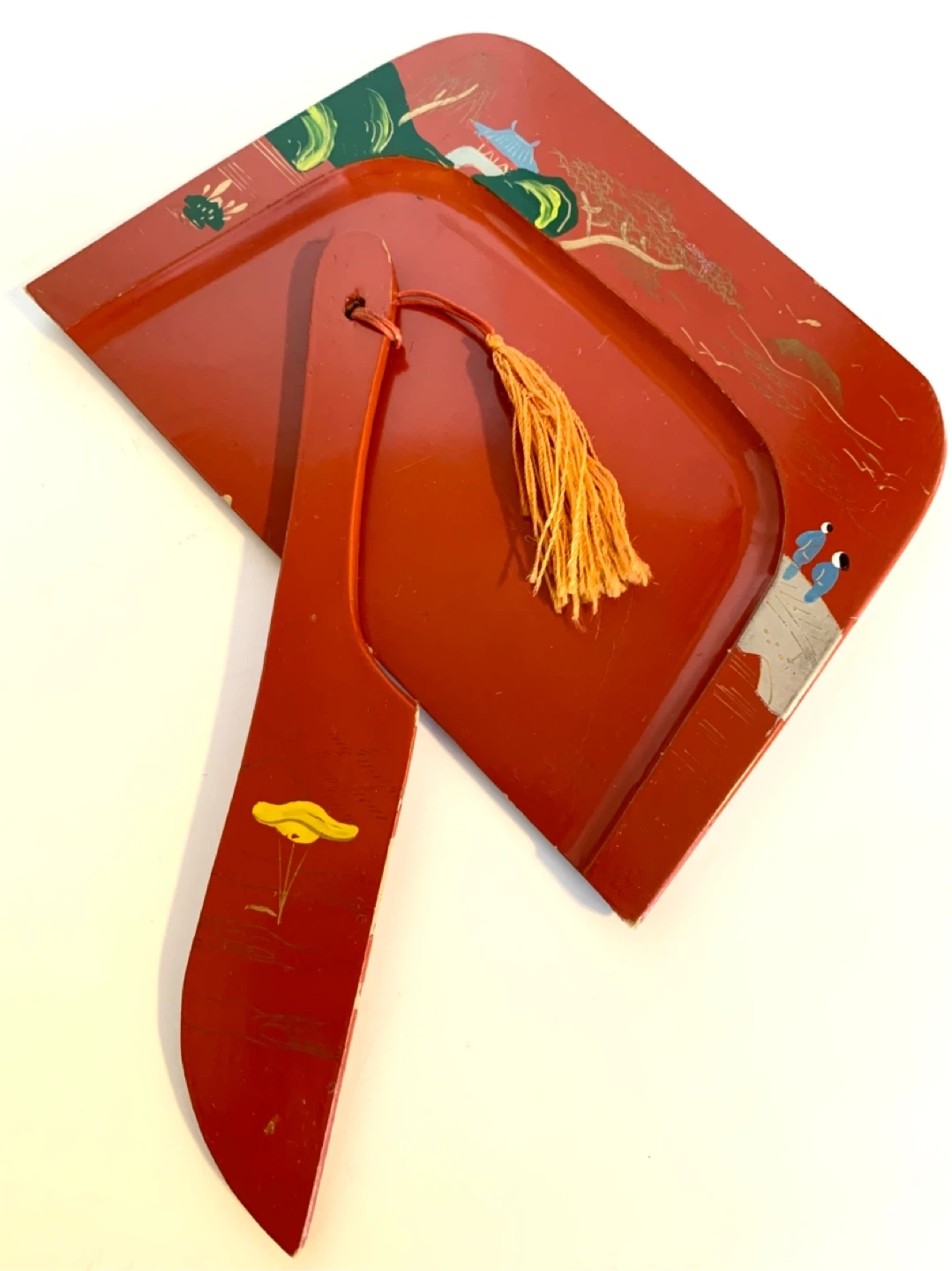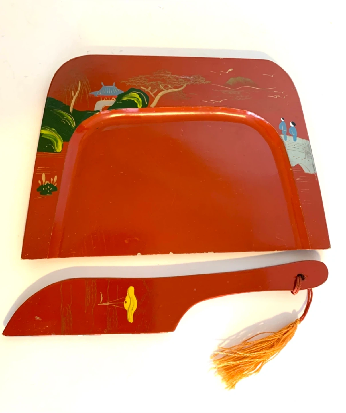 This is a decorative vintage dustpan and brush set. It's made of red lacquered wood with hand-painted Japanese-style scenery. The set includes a dustpan and a matching brush. An orange tassel hangs from the brush handle.