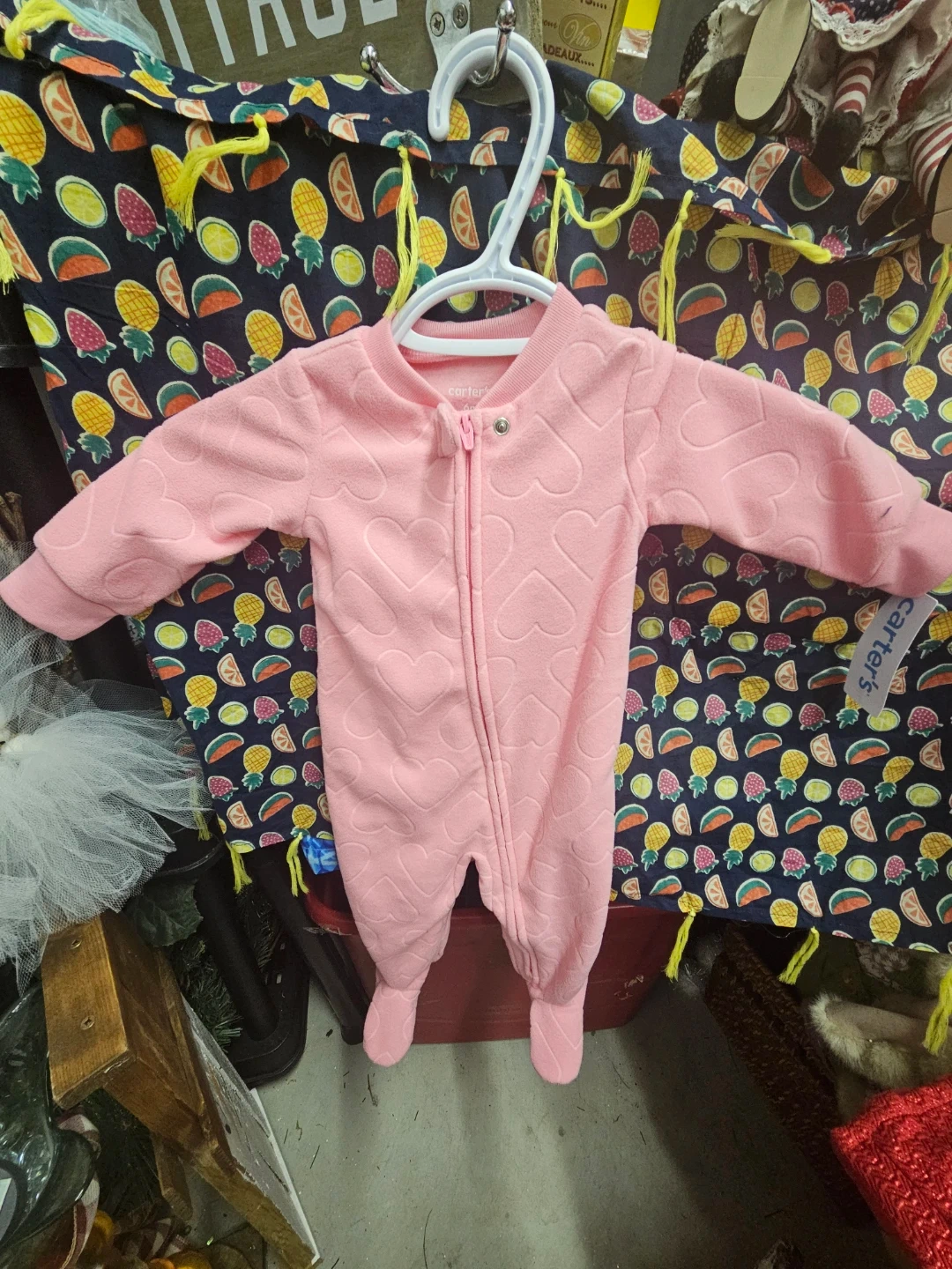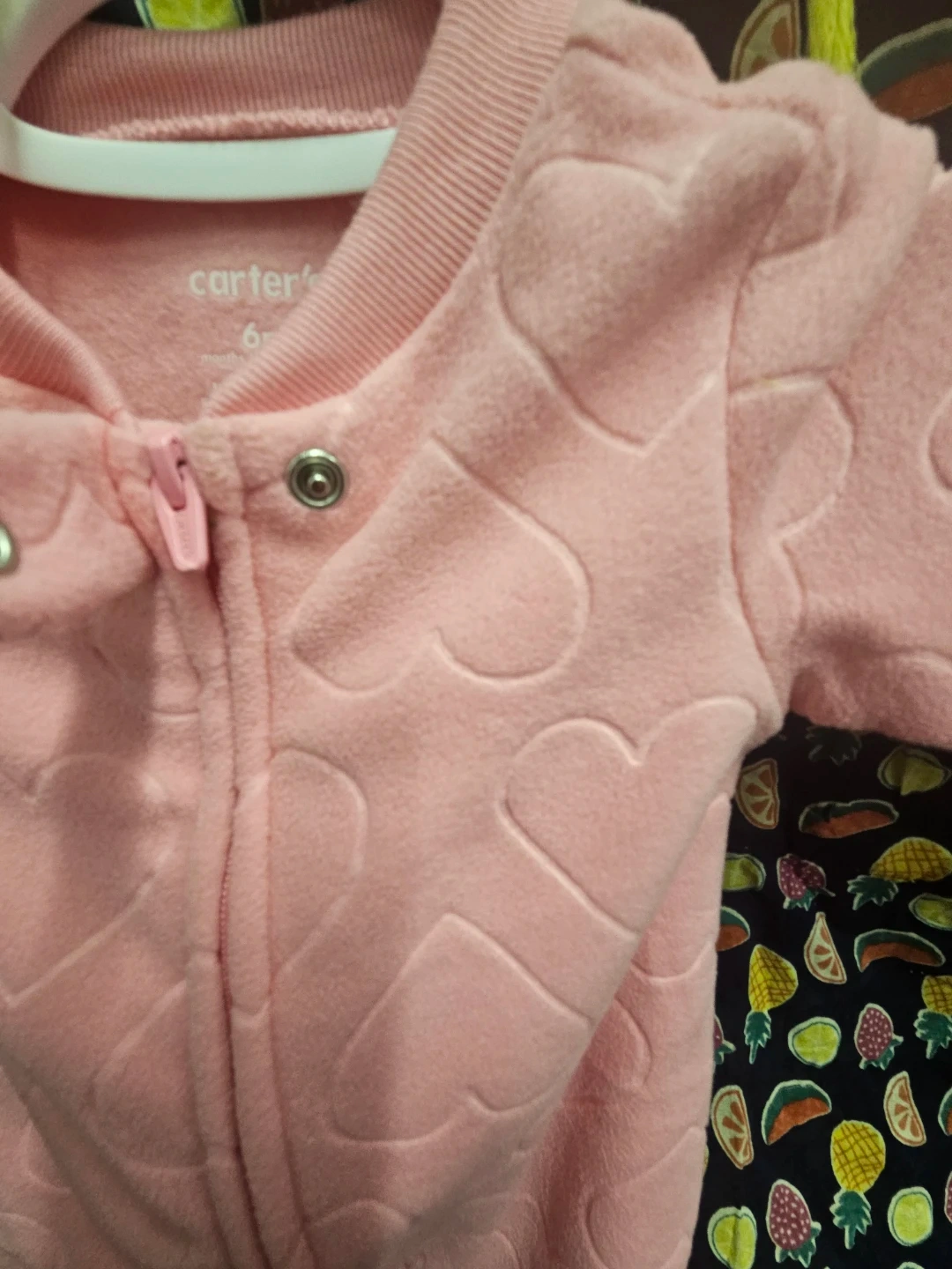 This adorable pink Carter's fleece sleeper features a cute embossed heart pattern. It's a 2-way zipper front for easy changes. Made for babies 6 months.