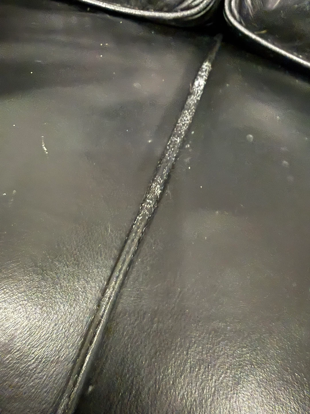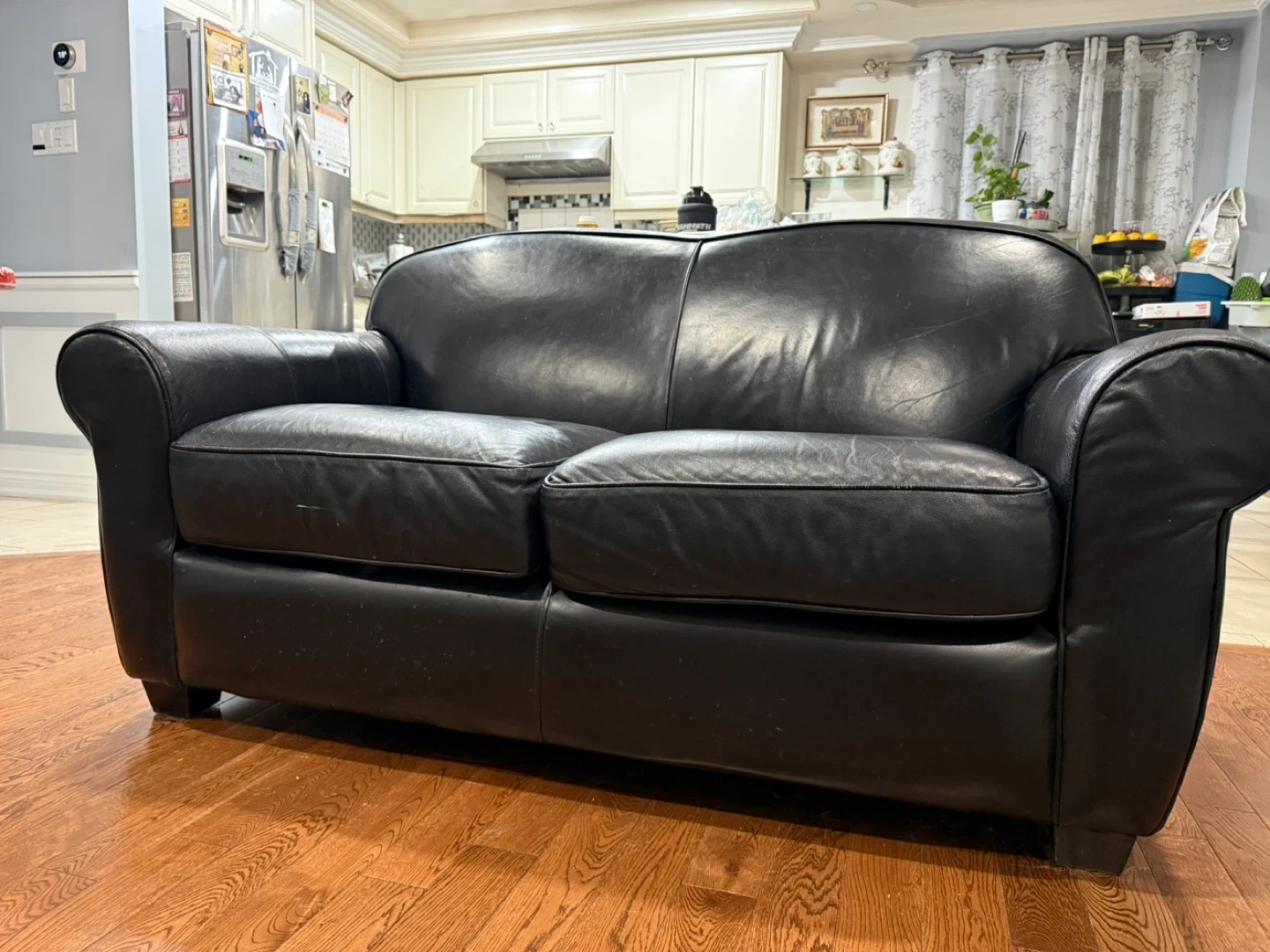 This is a black leather loveseat. It's in good condition with some minor scuffs. It's a comfortable two-seater couch.