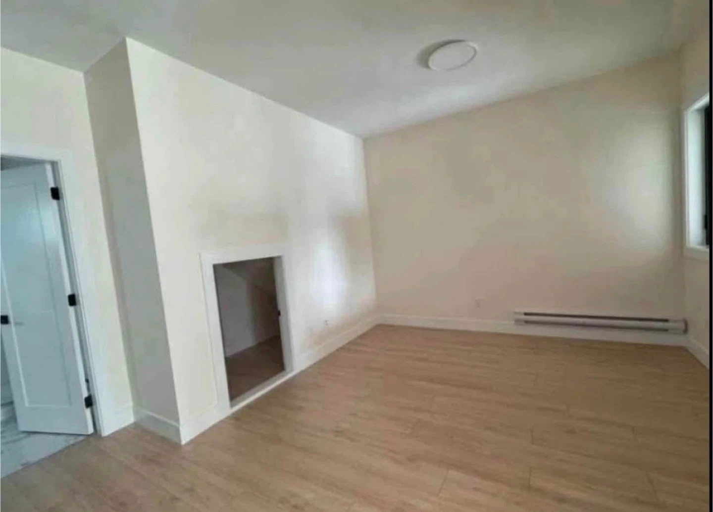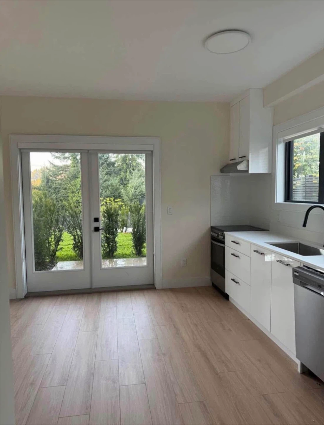 Newly renovated kitchen with white cabinetry, stainless steel appliances, and quartz countertops. The bathroom features a walk-in shower and modern fixtures. Spacious living areas with laminate flooring throughout. Ample natural light from large windows and patio doors.