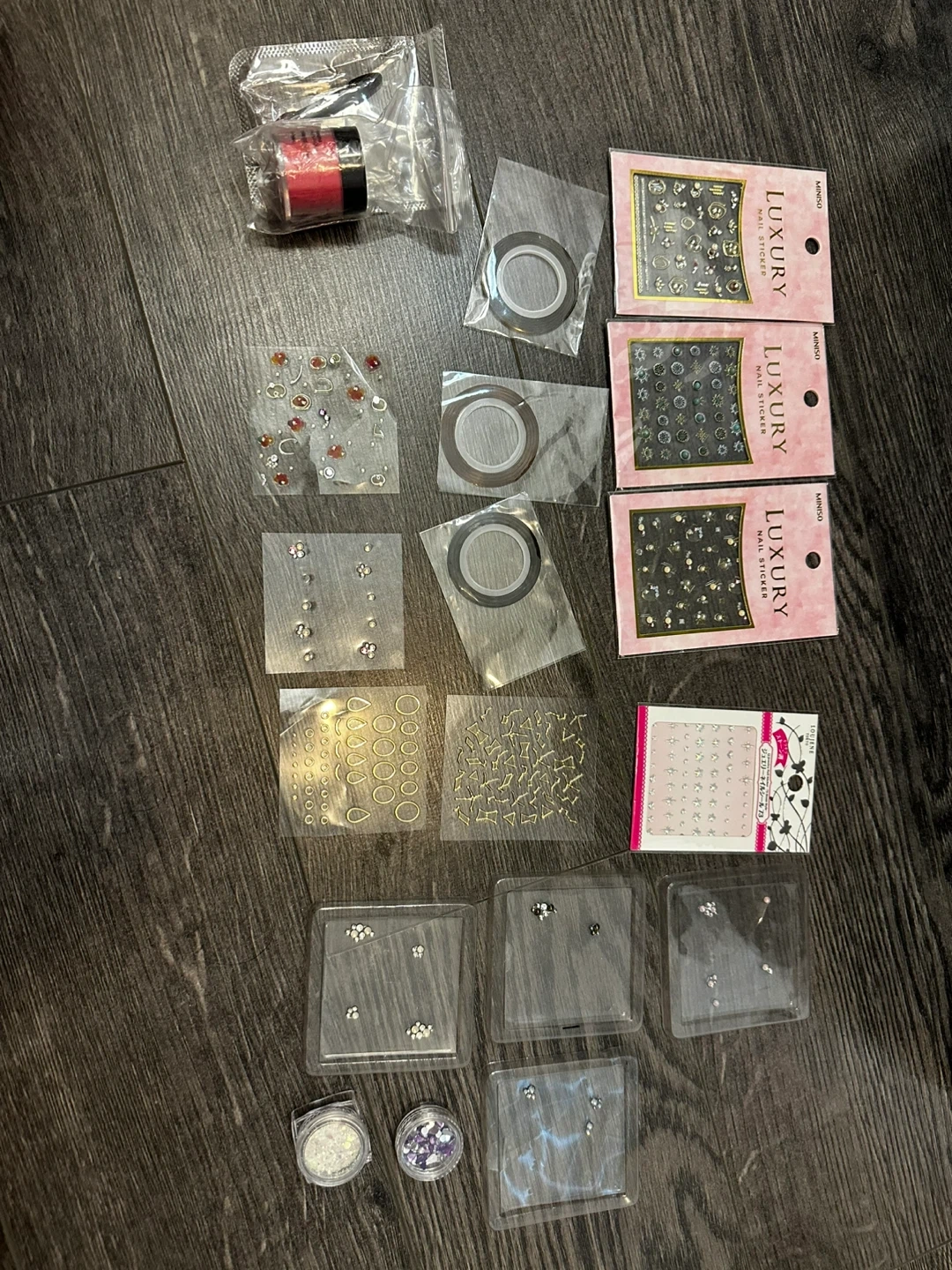 This set includes multiple packs of 'LUXURY Nail Stickers' along with various rhinestones, gems, and gold nail tape. It's a great collection for creating custom nail designs. Many small decorative pieces for detailed work.